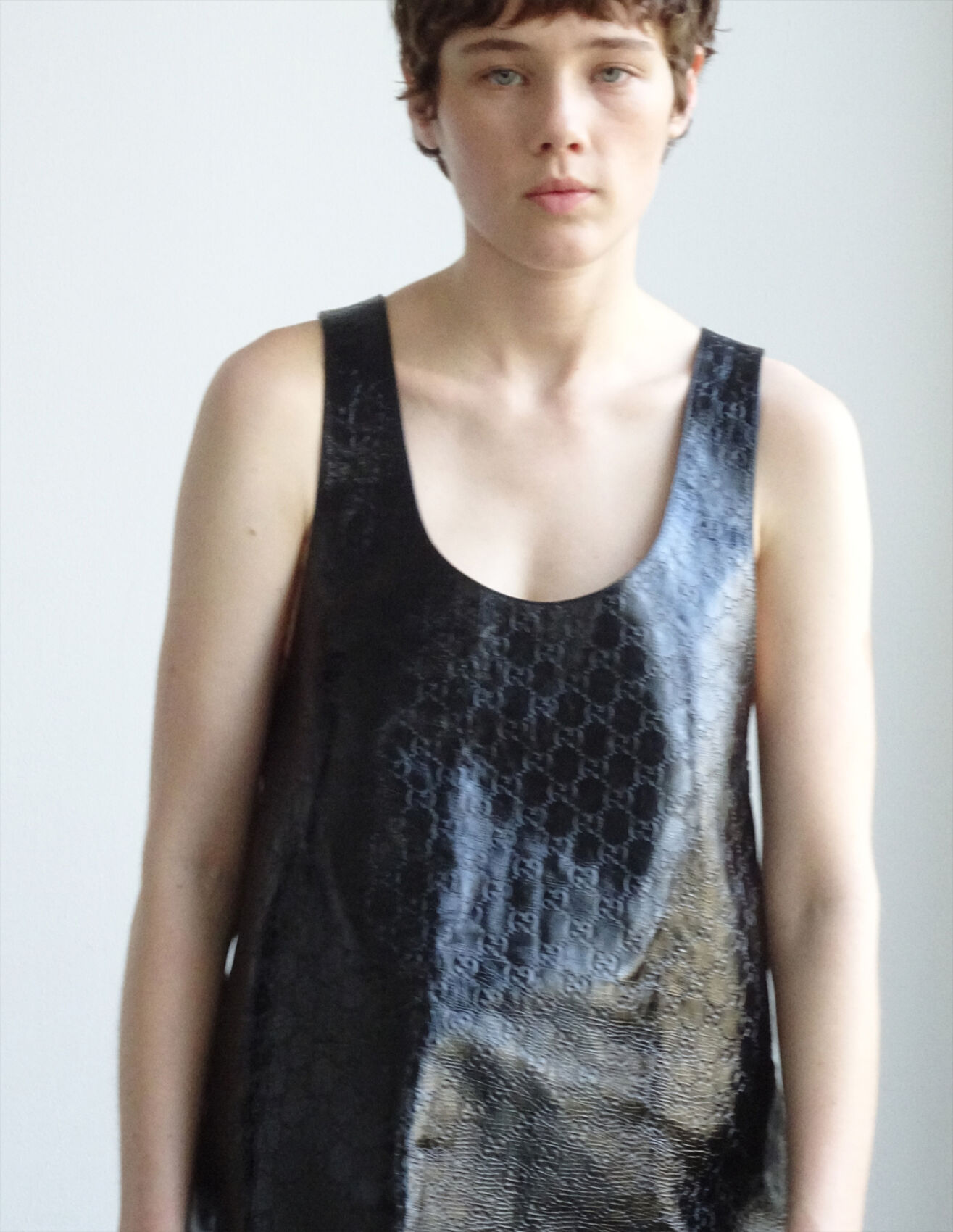 A person with short hair looks directly at the viewer, wearing a shiny sleeveless black top. The material has a textured, embossed pattern. Their expression is neutral, set against a light, unadorned background that enhances the focus on their upper body. The overall mood appears calm and introspective, with a minimalist aesthetic.