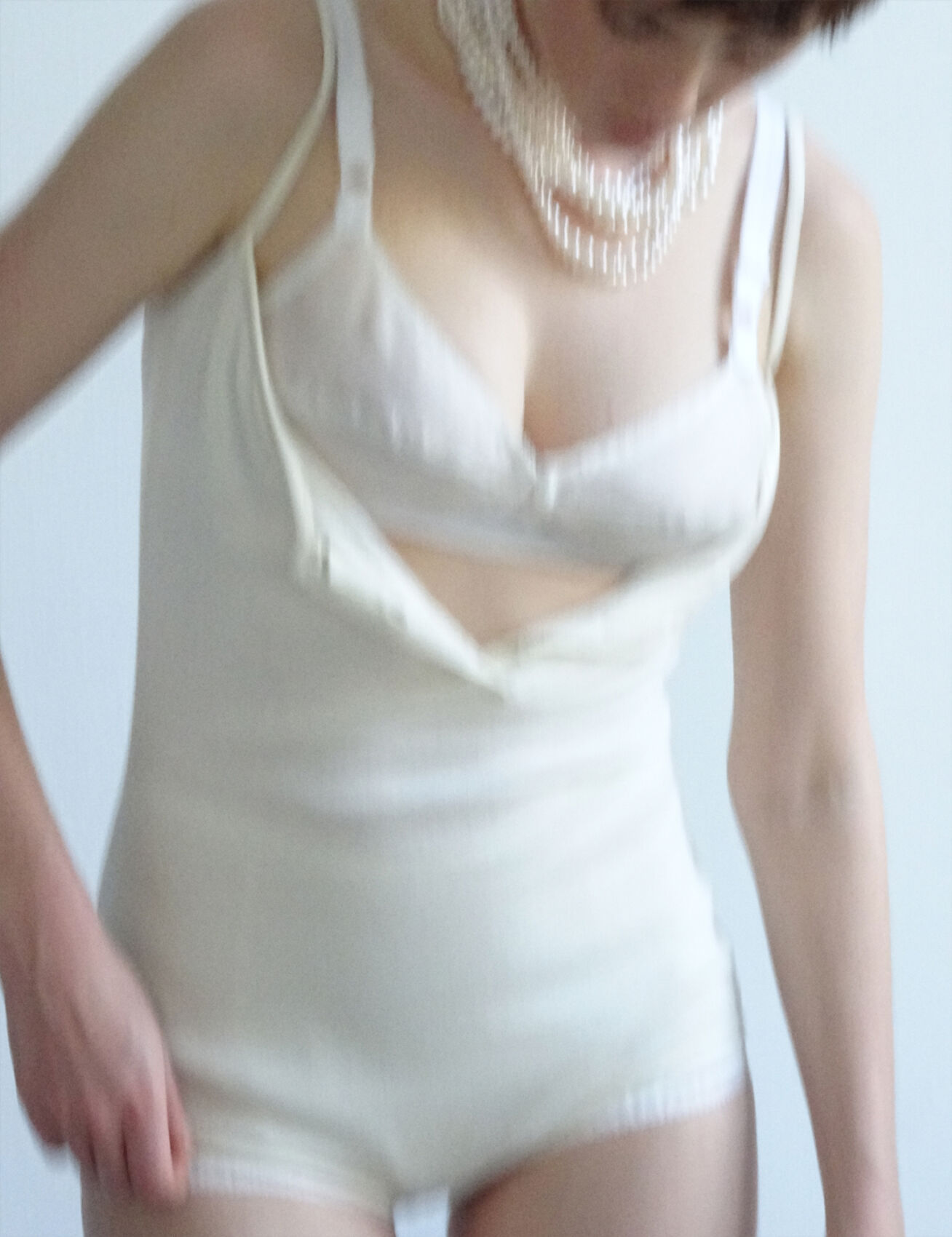 A person is depicted in soft focus, wearing a form-fitting, light-colored undergarment. Their shoulders are draped with a layered pearl necklace, and the outfit includes a strap detail. The pose suggests a downward glance, emphasizing elegance and a minimalist aesthetic. The composition uses faint colors and subtle lighting, creating a dreamy, ethereal effect that evokes timeless sophistication.