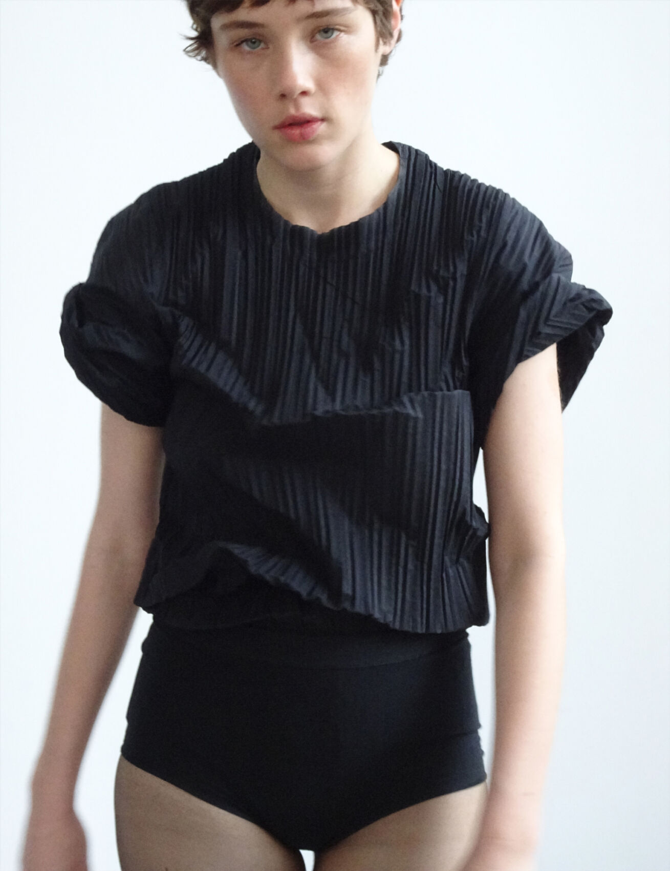 A person gazes forward wearing a black, short-sleeved, textured top paired with matching high-waisted bottoms. The outfit features subtle, vertical pleats, giving it a structured look. The individual has short hair and a neutral expression. The background is simple and plain, emphasizing the focus on the person's appearance and attire, exuding a minimalist and modern style.
