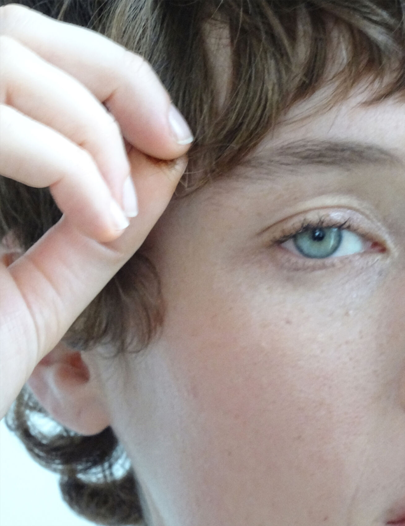 A close-up of an individual features a segment of their face, showcasing a green eye. Light skin tones exhibit subtle freckles. Short brown hair partially covers the forehead. A hand gently touches the hair, with well-maintained fingernails visible. The background is neutral, ensuring focus remains on the detailed facial and hand elements.