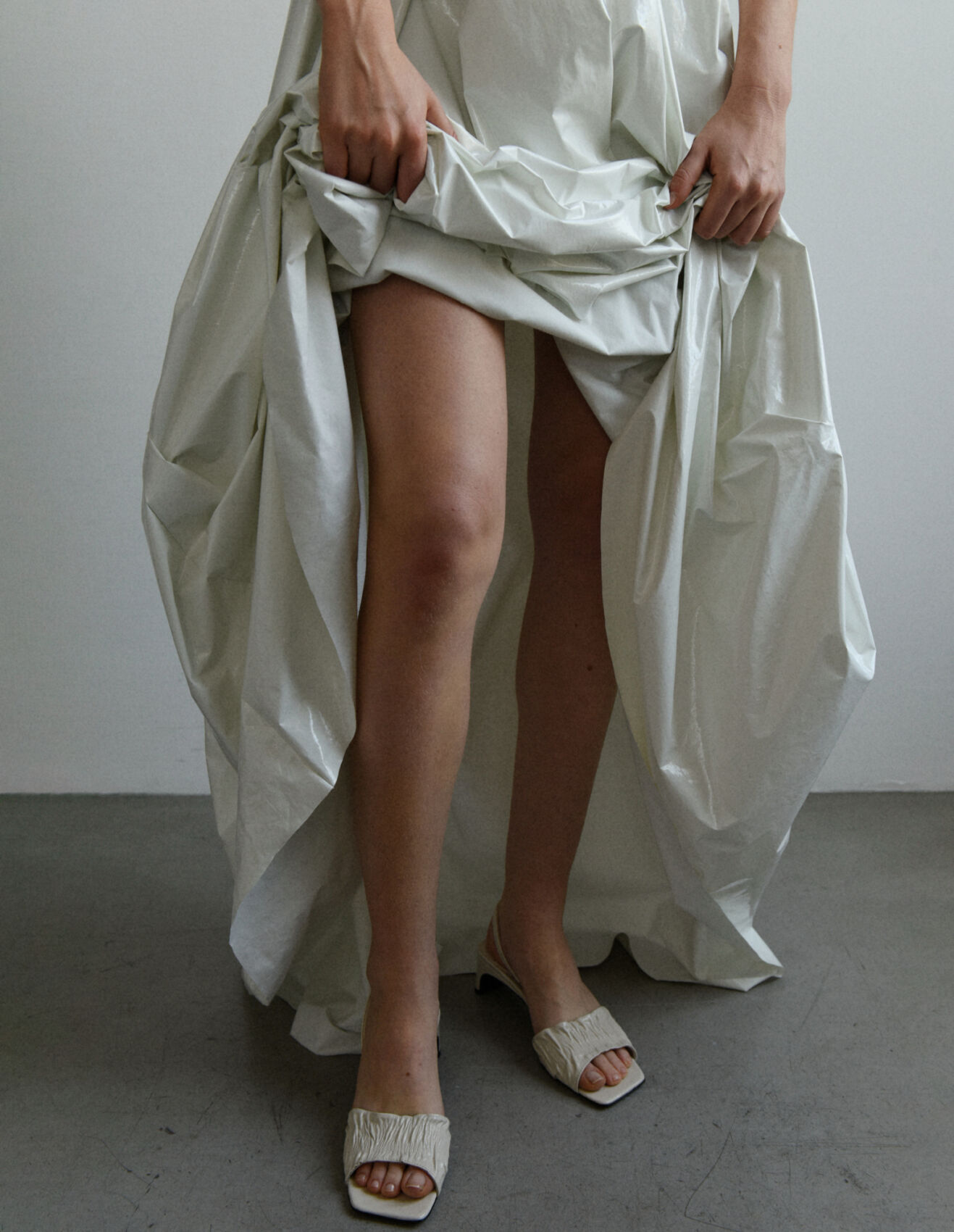 A person is depicted holding up a voluminous, crinkled white fabric, revealing their legs. They wear off-white, textured, open-toe sandals on a plain concrete floor. The setting has a minimalist aesthetic, with soft lighting casting gentle shadows. The focus is on the contrast between the flowing material and the skin, creating an elegant and serene atmosphere.