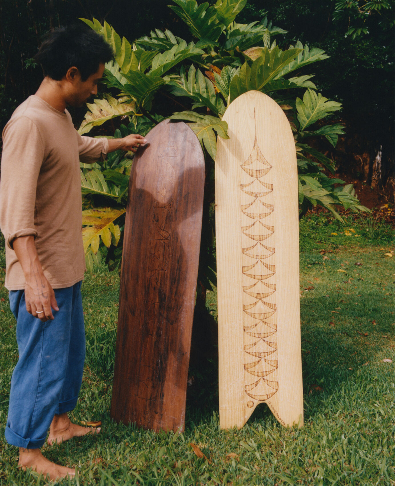 A person stands on lush green grass, examining two elegantly crafted wooden boards. One board is dark with a smooth surface, the other is lighter with intricate carvings. Behind them, vibrant green leaves from a plant create a natural backdrop, emphasizing the craftsmanship and organic setting. The scene exudes a sense of connection to nature and artistry.