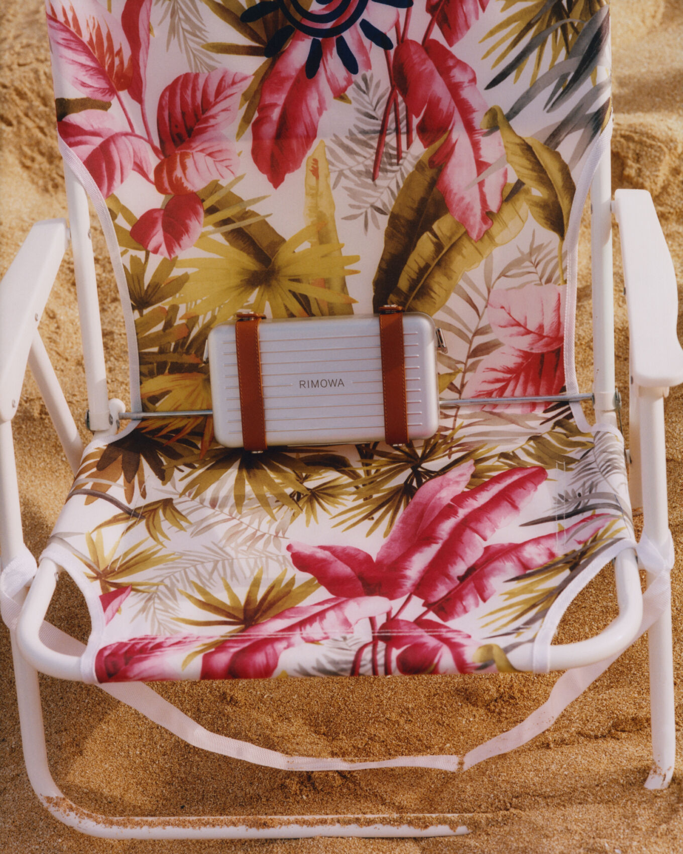 A beach scene showcases a floral-patterned chair nestled in golden sand, capturing a relaxed, summery atmosphere. The design highlights vibrant pink, green, and white tones, reminiscent of tropical settings. A silver, compact suitcase with brown leather straps rests on the chair, suggesting travel or leisure activities, evoking wanderlust and a desire for relaxation and adventure.