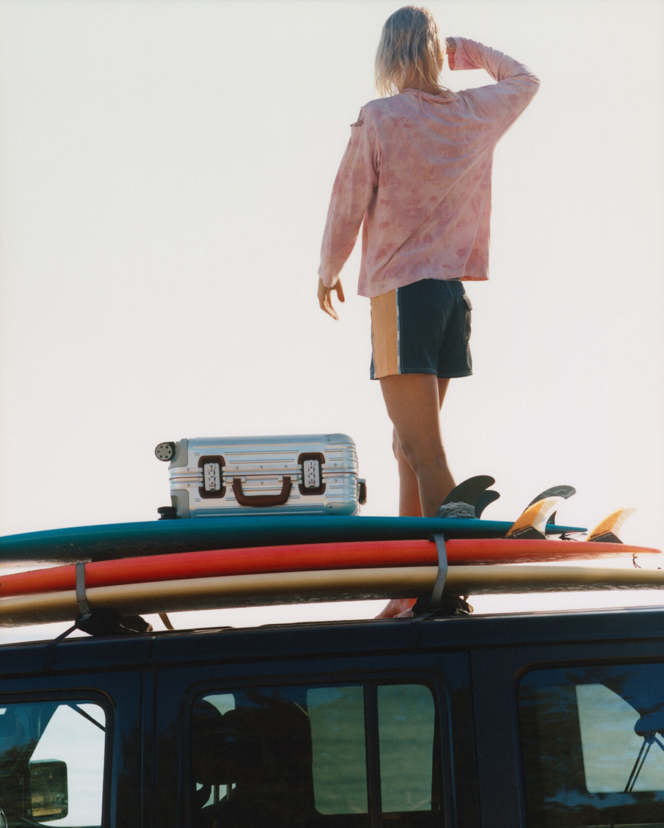 A person stands on the roof of a vehicle, gazing into the distance. They wear a pink long-sleeve shirt and dark shorts. Beside them, a silver suitcase and three surfboards, each in bright colors, are secured to the roof. The setting suggests a beach outing, with clear skies overhead and the reflection of water visible in the car window.