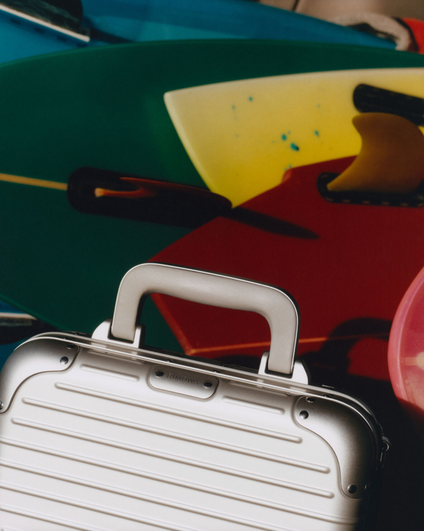 A sleek, silver suitcase with a ribbed design and sturdy handle is placed in the foreground. In the background, a vibrant array of colorful surfboards in shades of green, yellow, red, and blue, with visible fins, create a dynamic and lively composition. Shadows and reflections add depth and contrast to the overall scene.