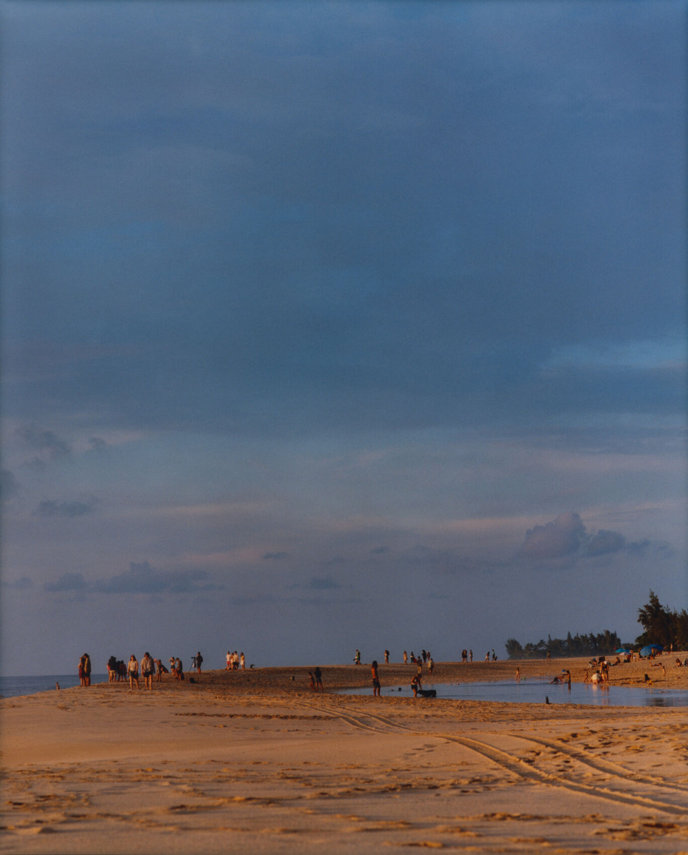 A serene beach scene captures the essence of a calm, early evening. The sky displays shades of blues and soft hues, meeting the horizon where gentle waves kiss the sandy shore. Small groups of people wander along the beach, enjoying the tranquil surroundings. The distant trees create a natural frame, enhancing the picturesque coastal landscape.