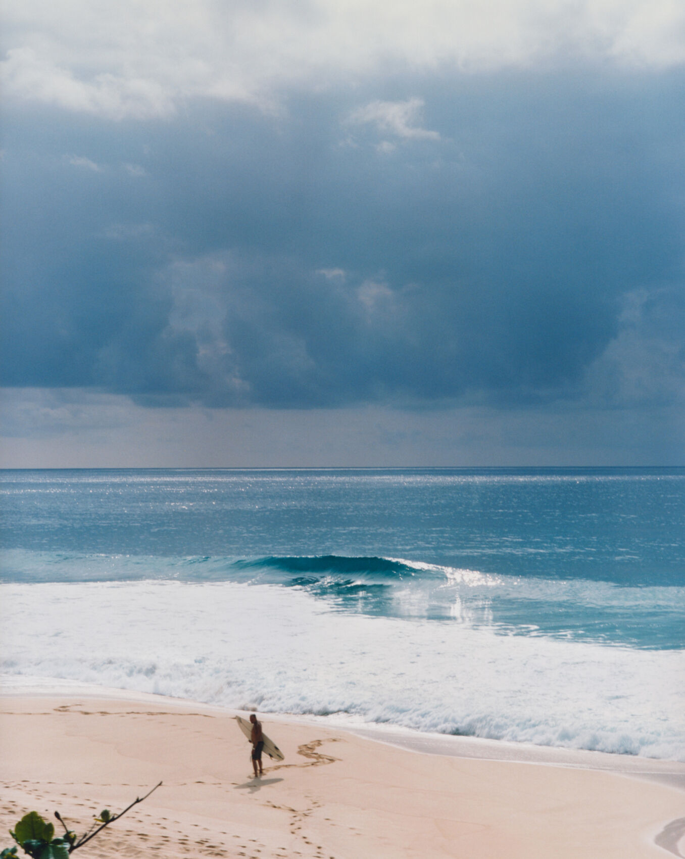 A lone surfer stands on a sandy beach, holding a surfboard, with footprints trailing behind. The ocean waves gently crash on the shore under a vast, cloudy sky. The scene conveys a serene, reflective moment, balancing the turquoise sea's vibrancy with the moody, overcast atmosphere above, hinting at upcoming rain.