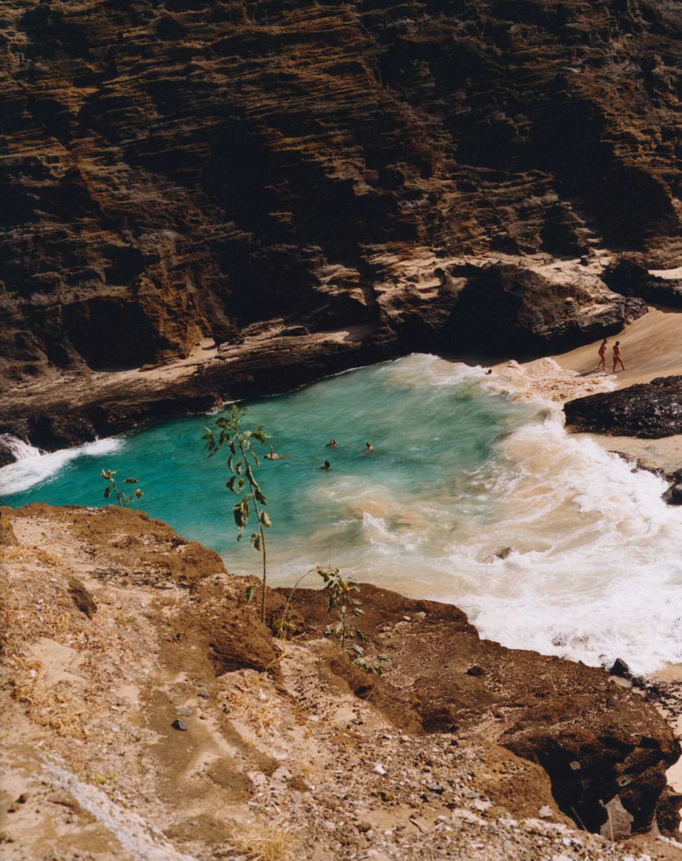 Turquoise waves gently lap against a secluded sandy beach, surrounded by rugged cliffs. People are seen enjoying the water, swimming and wading close to the shore. Two individuals walk along the sandy edge, contrasting against the rocky backdrop. Sparse vegetation clings to the rocky terrain, enhancing the tranquil and remote atmosphere of this coastal paradise.