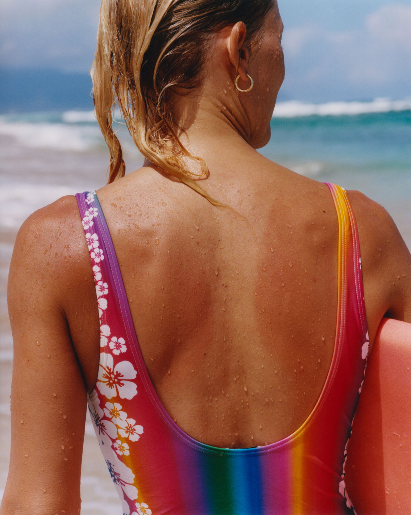 A person stands on a beach, facing the ocean. Their back is visible, with droplets of water glistening on sun-kissed skin. They wear a vibrant, rainbow-hued swimsuit adorned with white floral patterns and hold a pink surfboard. Blond hair drapes down from a ponytail, and blue skies with wispy clouds frame the background, complementing the serene seascape.