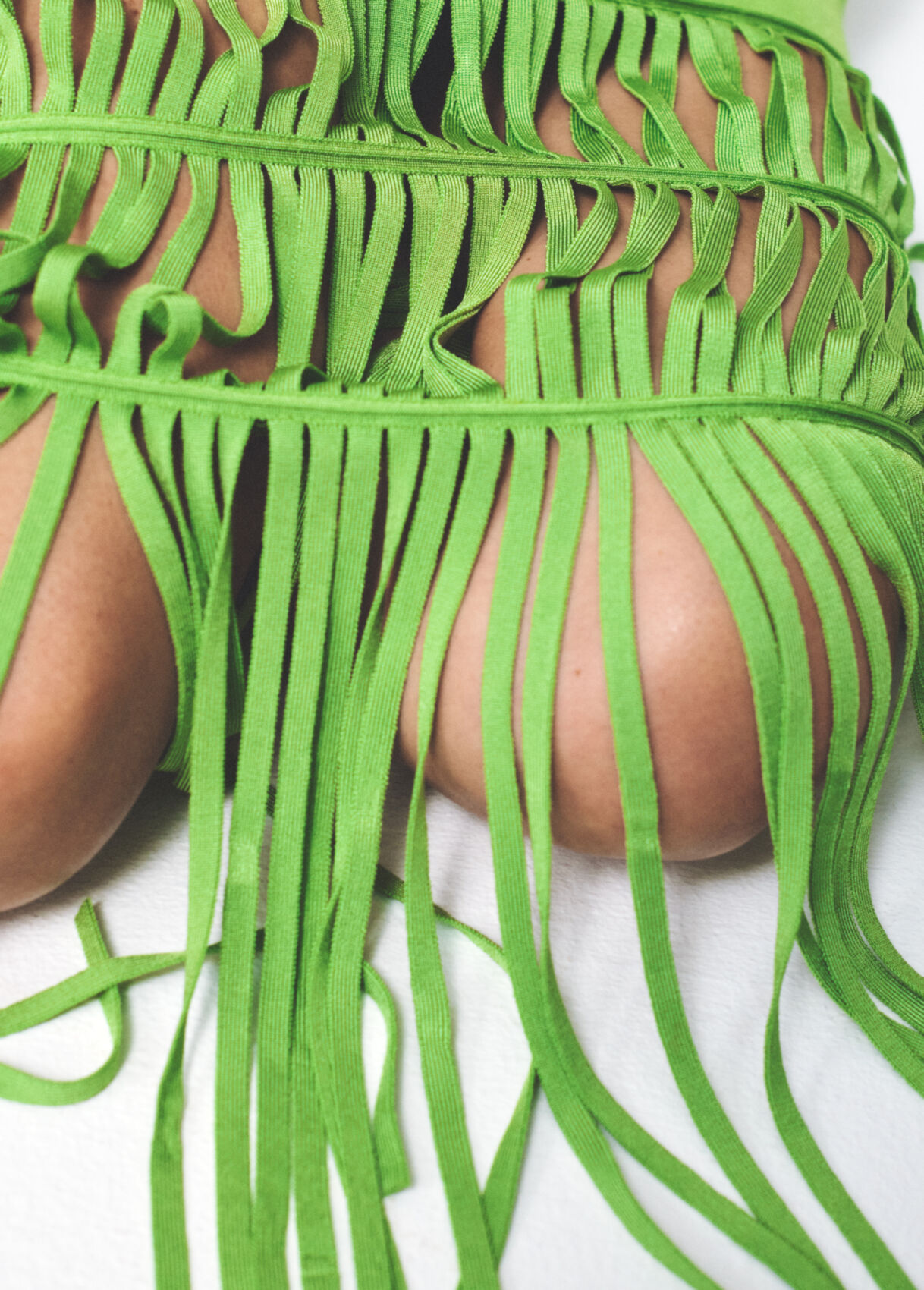Bright green strips of fabric intricately woven in a horizontal and vertical pattern create a vibrant visual effect. The strips are placed over a neutral background, contrasting vividly with the surroundings. The arrangement adds texture and dimension, with some strips curling naturally, casting slight shadows. The result is both playful and dynamic, drawing the eye with its boldness.