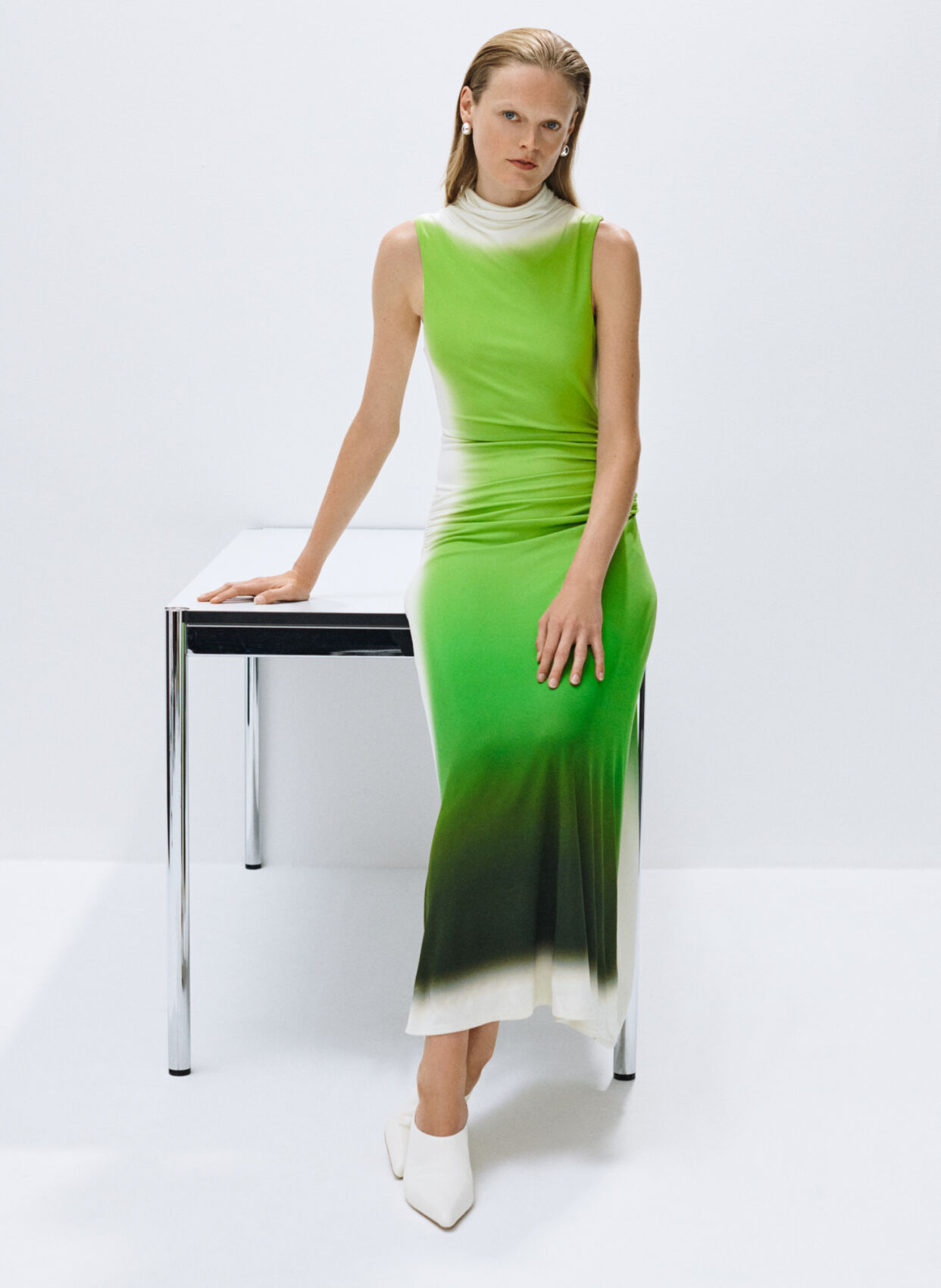 A person with blonde hair stands against a minimalistic backdrop, leaning on a black and chrome table. They wear a sleek, sleeveless dress in ombré shades of green and white, paired with pointed white heels. The ambiance is modern, with a focus on soft lighting and clean lines, creating an elegant, contemporary vibe.