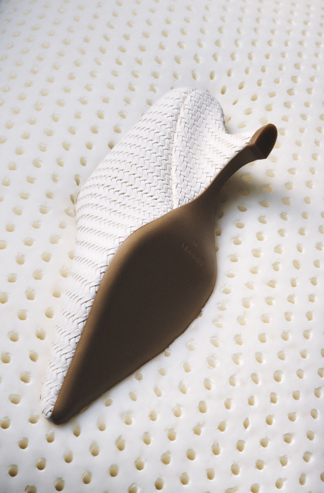 A stylish white shoe with a woven texture lies on a surface covered in evenly spaced holes. The shoe features a unique heel design, blending seamlessly into its smooth, brown base. The background showcases a soft, light appearance with a repeating pattern, creating a contrast that highlights the intricate details and craftsmanship of the footwear.