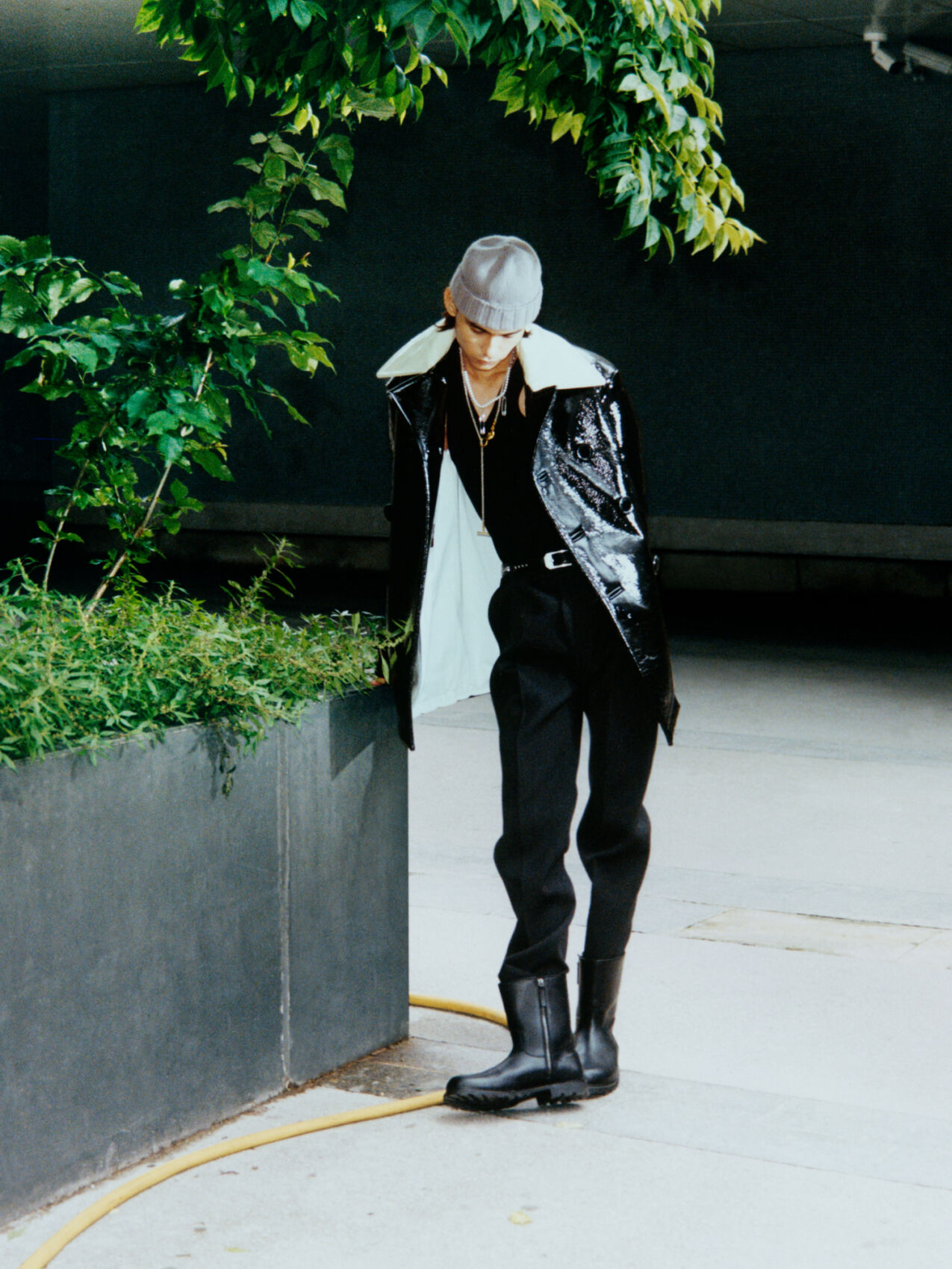 A person stands outside near a concrete planter filled with lush greenery. They are wearing a stylish, glossy coat with a wide collar over a black outfit. Black boots and a gray beanie complete the modern ensemble. The scene conveys a blend of nature and urban fashion, with a garden hose subtly visible in the environment.
