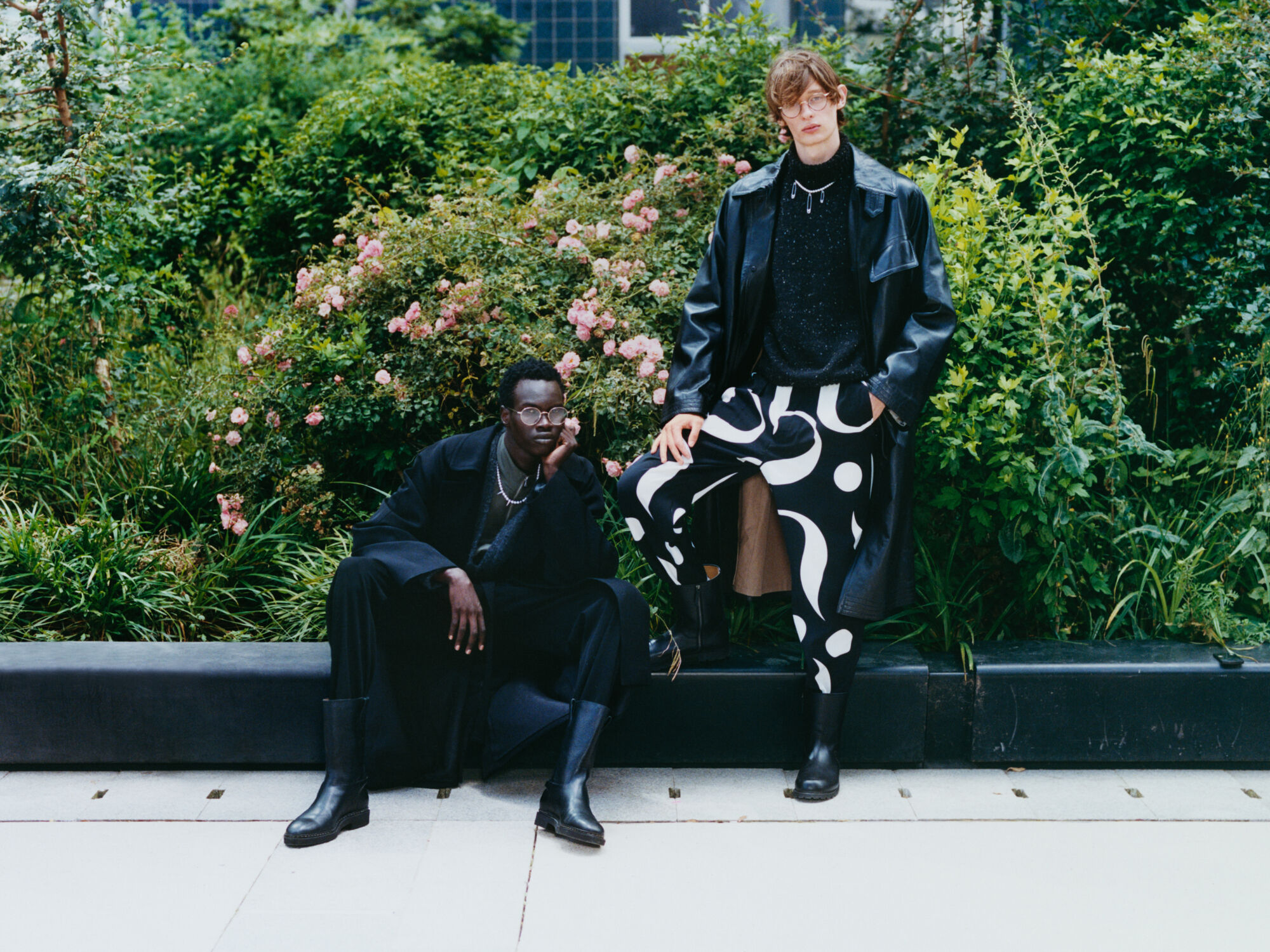 Two individuals pose stylishly against a lush backdrop of greenery and blooming pink flowers. One sits casually wearing dark attire with glasses, exuding a relaxed vibe. The other stands confidently, sporting a black coat and bold patterned pants. Their expressions and fashion choices convey a blend of modern elegance and artistic flair, enhanced by the vibrant natural surroundings.