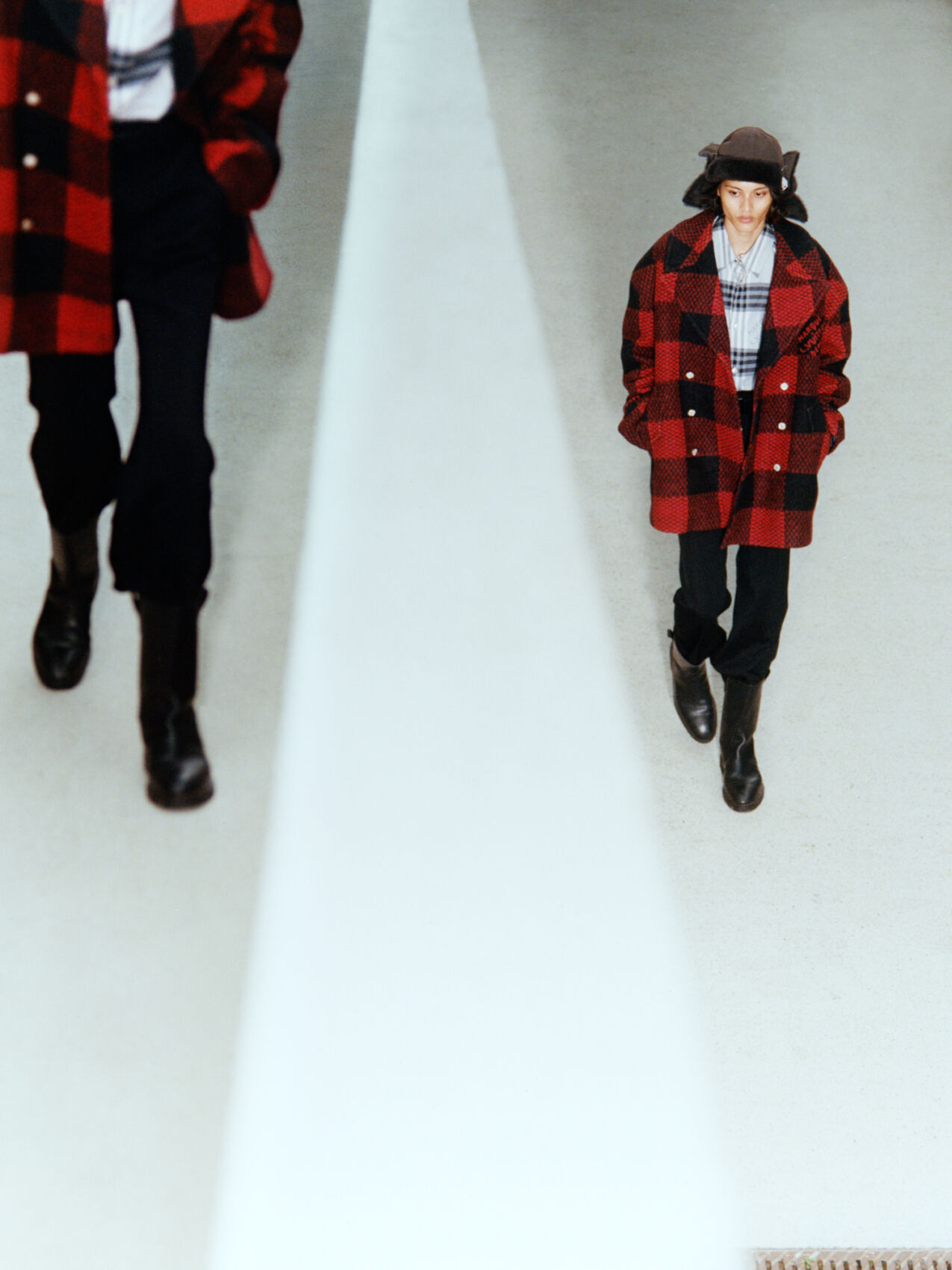 A person strides confidently on a minimalist runway, wearing a stylish oversized red and black checkered coat, paired with a plaid shirt underneath. Their outfit is completed with black pants and boots, topped off by a dark brown hat. The background is a simple, light-toned space with a reflective floor, emphasizing the fashion-forward ensemble.