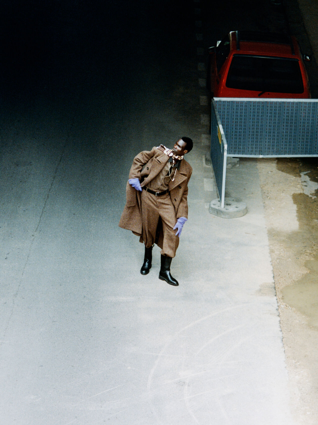 A person wearing an oversized brown outfit with a matching coat stands on an urban street. They have purple gloves and are mid-motion, slightly leaning back. A red car is parked next to a blue-grey barricade on the right. The concrete surface is divided by a visible line, creating a dynamic, contrasting atmosphere.