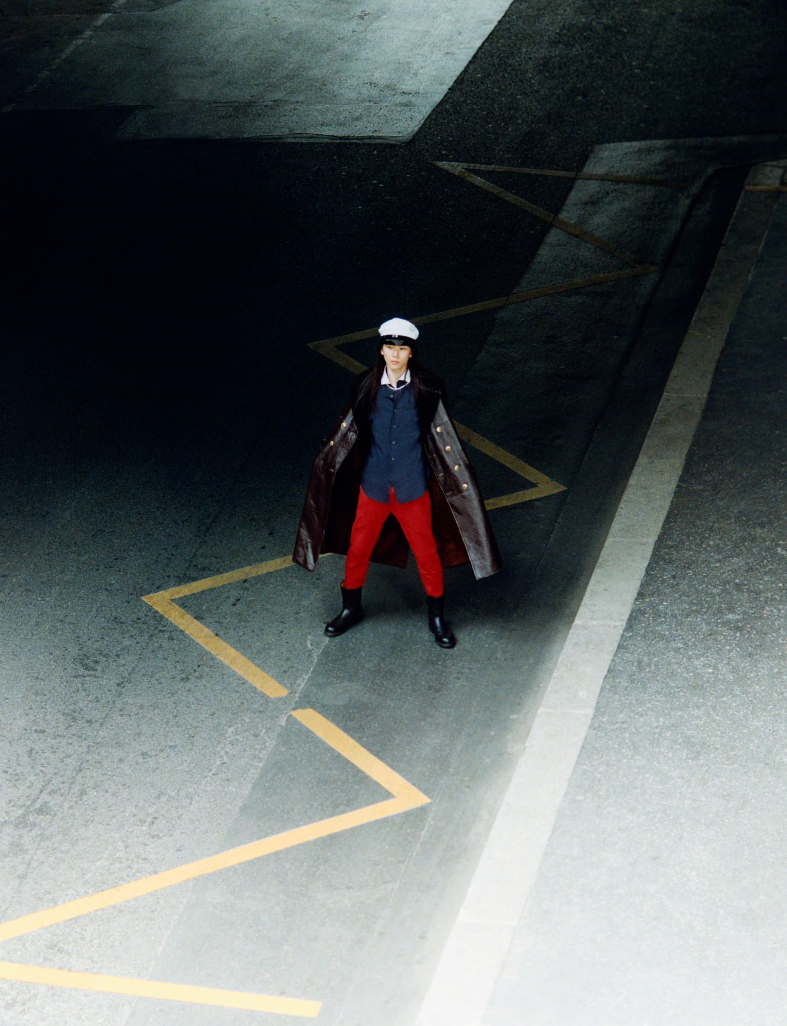 A person stands on a dark urban street, wearing a long coat, bright red pants, a dark shirt, and a white cap. The setting includes distinct road markings in yellow, forming zigzag patterns. The high contrast between the attire and the dimly lit background creates a dramatic and vivid scene, highlighting the figure's bold fashion choice.