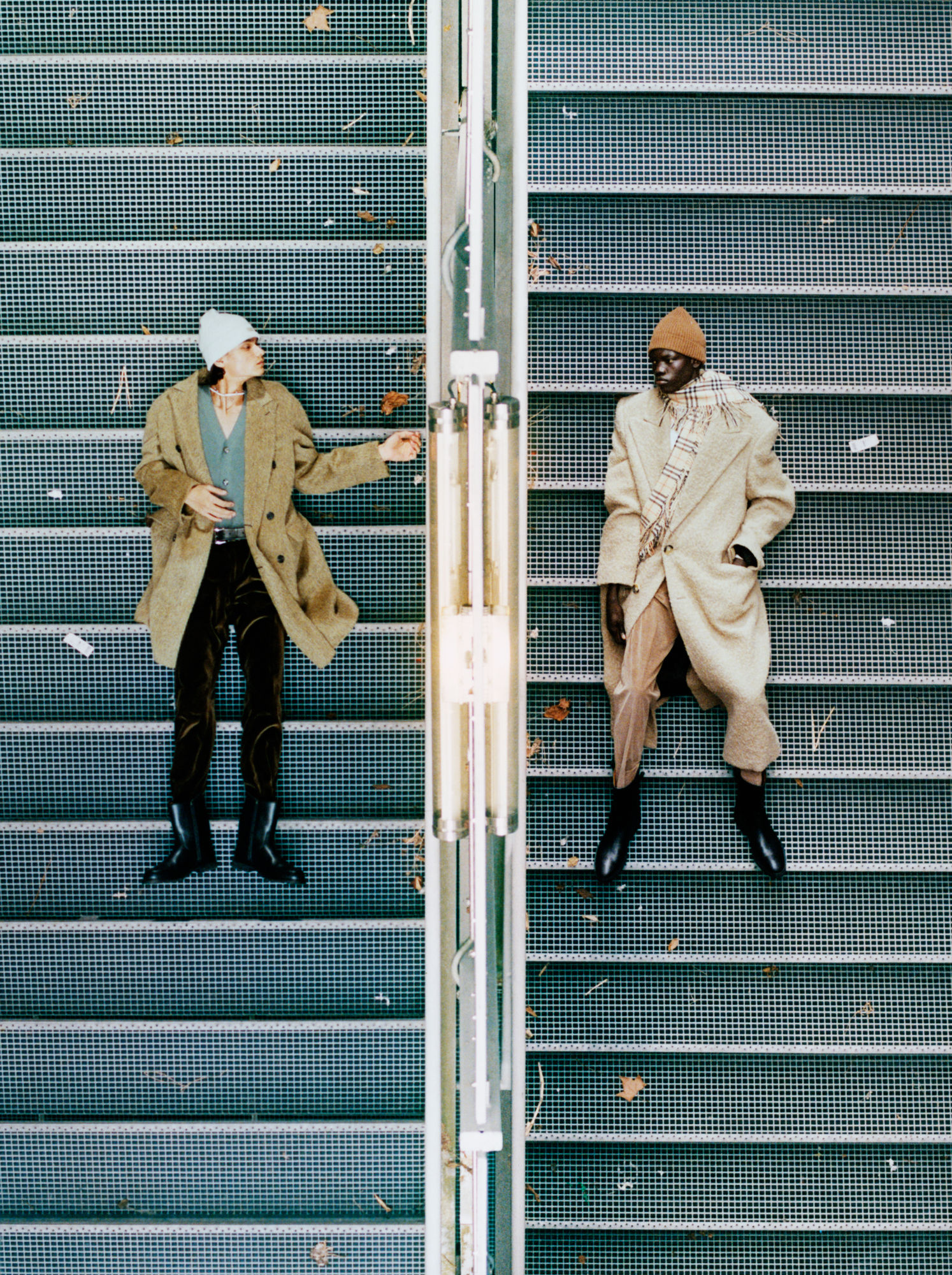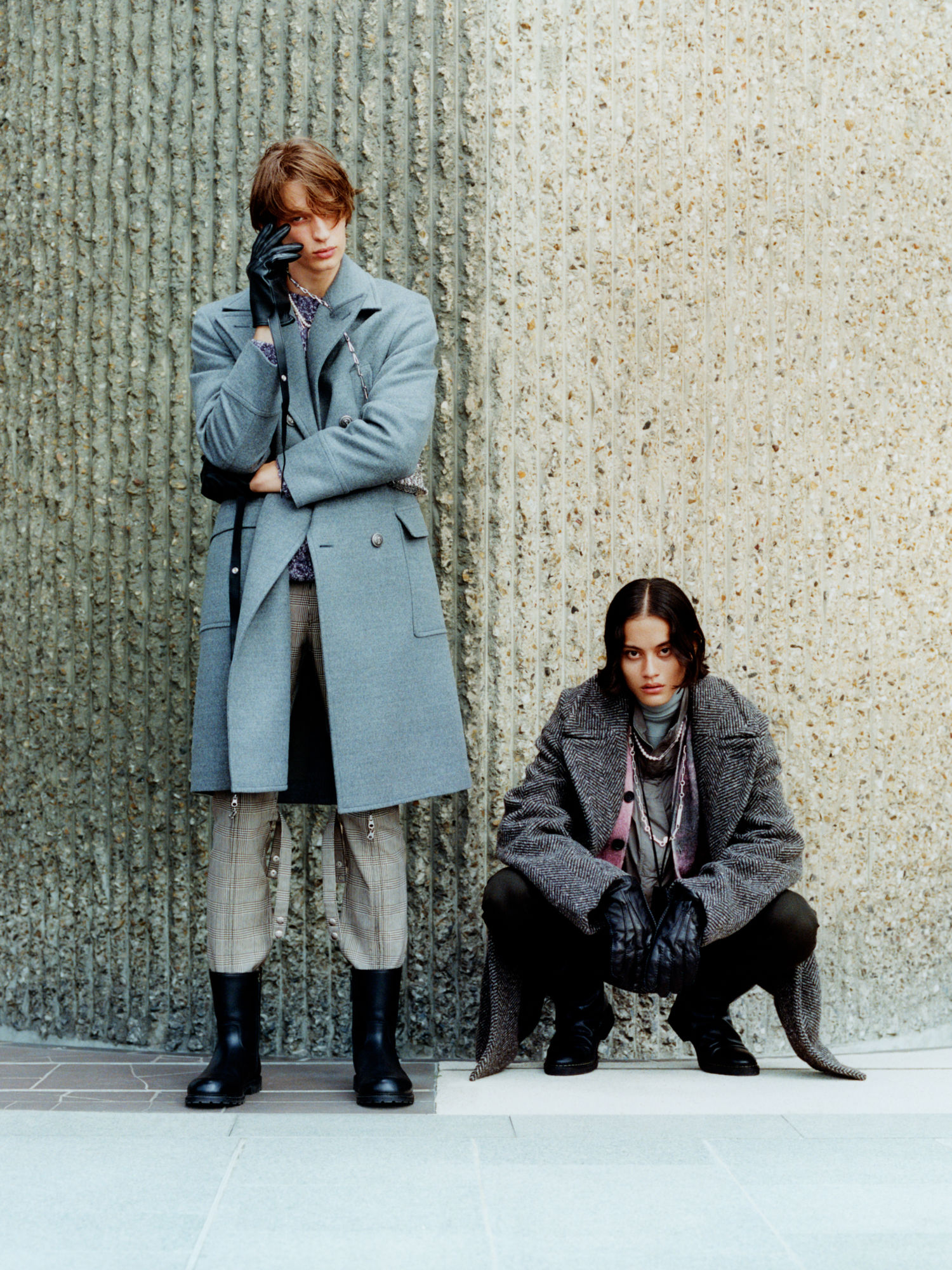 Two individuals pose against a textured wall. One stands wearing a long blue coat, plaid pants, and black gloves, exuding a contemplative demeanor. The other squats beside them in a bulky gray coat, layered clothing, and gloves. Their expressions are serious and fashion-forward, set against a muted background of rough, vertical lines that add depth and contrast.