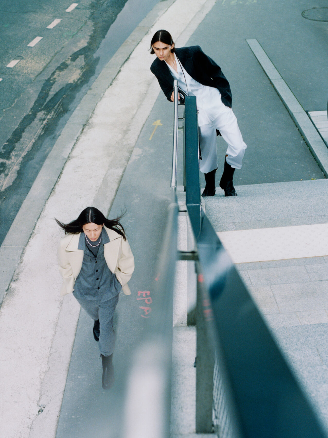 Two individuals are captured from an overhead perspective, both walking on an urban sidewalk. One wears a light coat over a gray outfit, hands in pockets, striding forward. The other, dressed in a dark jacket over white clothing, leans casually against a rail on a staircase. The surrounding environment includes pavement, a road, and marked asphalt.