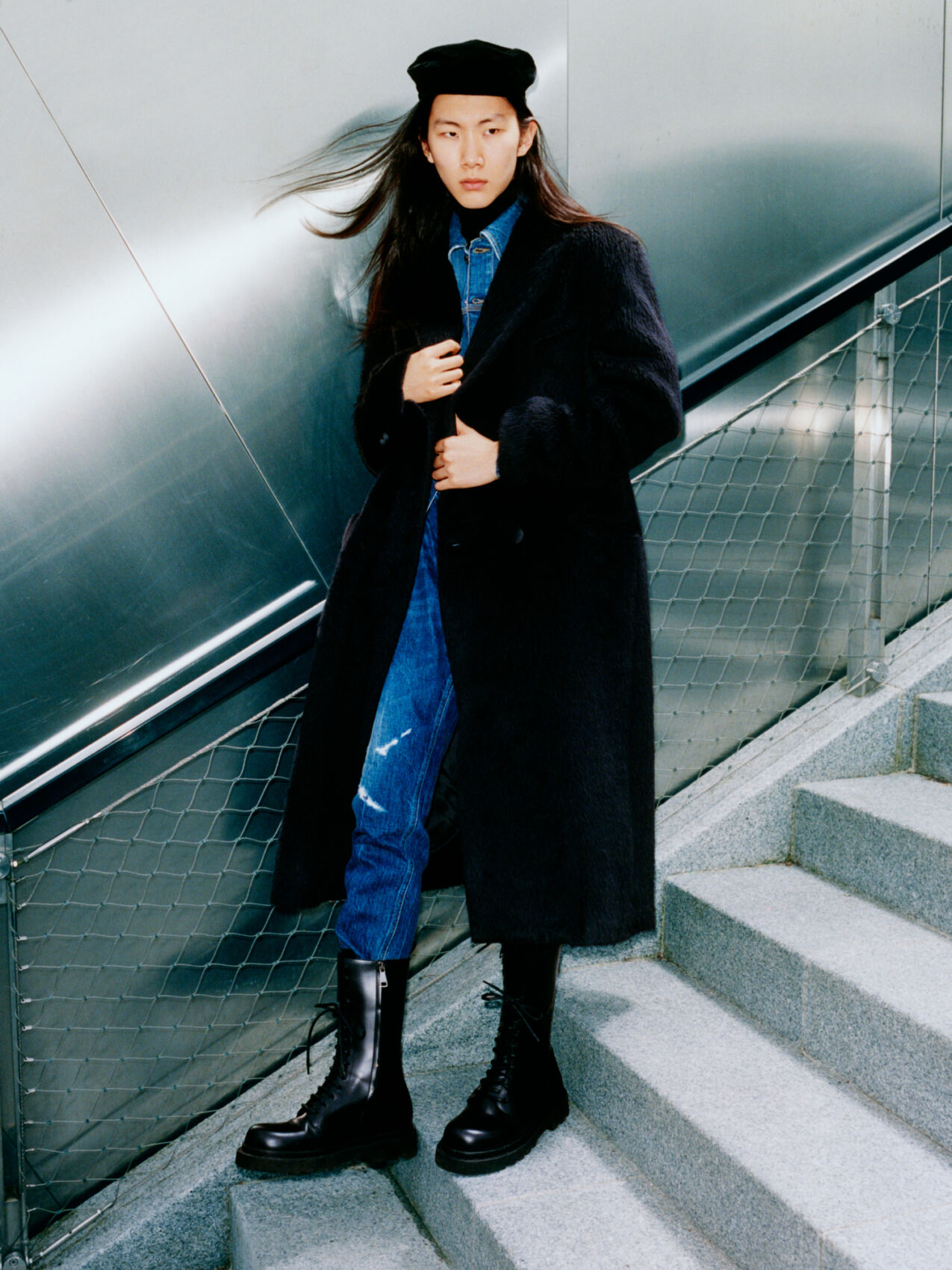 A person stands confidently on a stairway, donned in an oversized black coat over a denim outfit. They wear a black beret and large black lace-up boots. Their long hair flows in the breeze as they stand against a metallic, industrial-style background with a mesh railing. The setting is modern and stylish, emphasizing a chic, urban fashion sense.