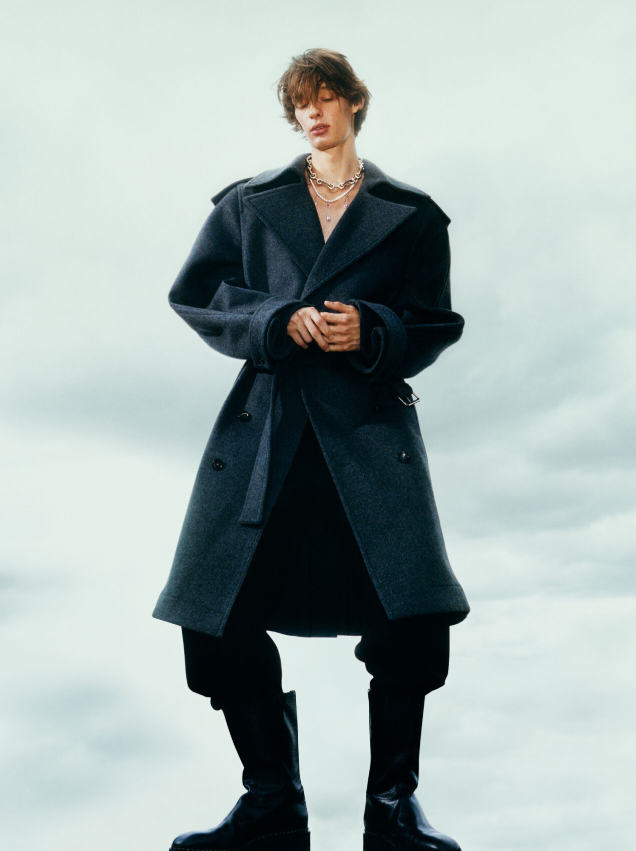 A person stands against a soft, cloudy sky wearing a stylish, oversized dark coat. The coat is double-breasted with large lapels and paired with loose black pants and shiny tall boots. Short, tousled hair falls over their forehead, and they wear chunky silver chain necklaces, creating a sophisticated yet contemporary look. The atmosphere is serene and fashionable.
