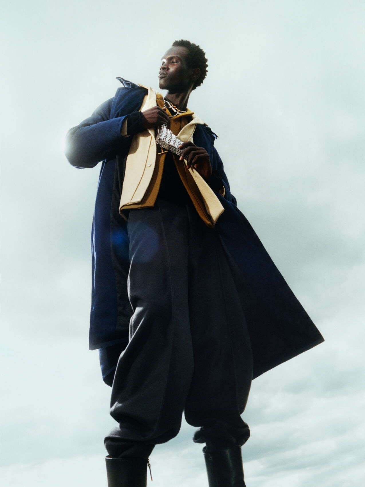 A stylish individual exudes confidence, dressed in an ensemble of a dark coat layered over a pale jacket and sweater. Voluminous pants and sturdy boots complete the look. The person holds a sparkling accessory, and gazes upward against a backdrop of a cloudy sky, capturing a sense of movement and elegance from a low-angle perspective.