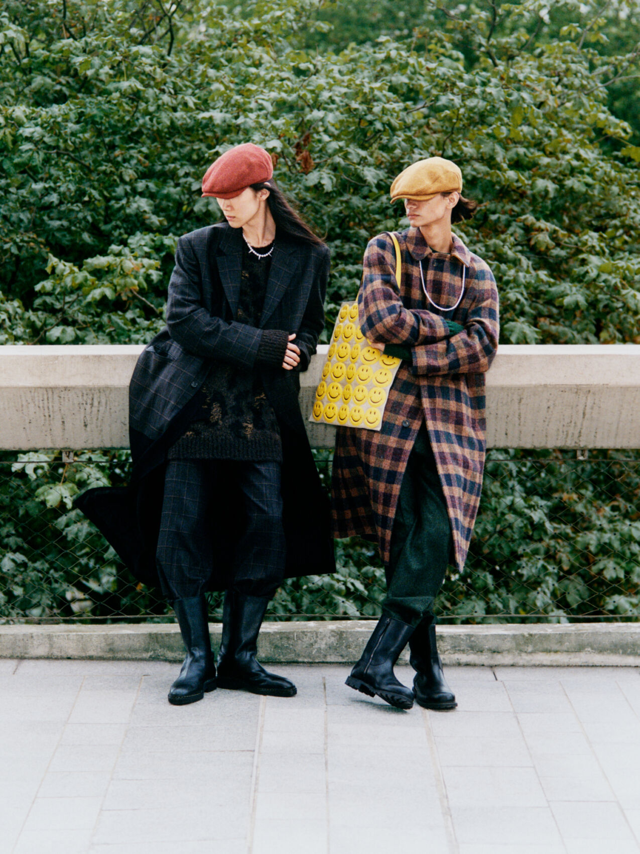 Two individuals stand on a concrete walkway, leaning against a railing. Both wear fashionable coats and caps—one in a dark ensemble, the other in a plaid pattern with a beige cap. They sport knee-high black boots. Behind them, lush greenery creates a natural backdrop. One person carries a yellow tote with a smiley face print.
