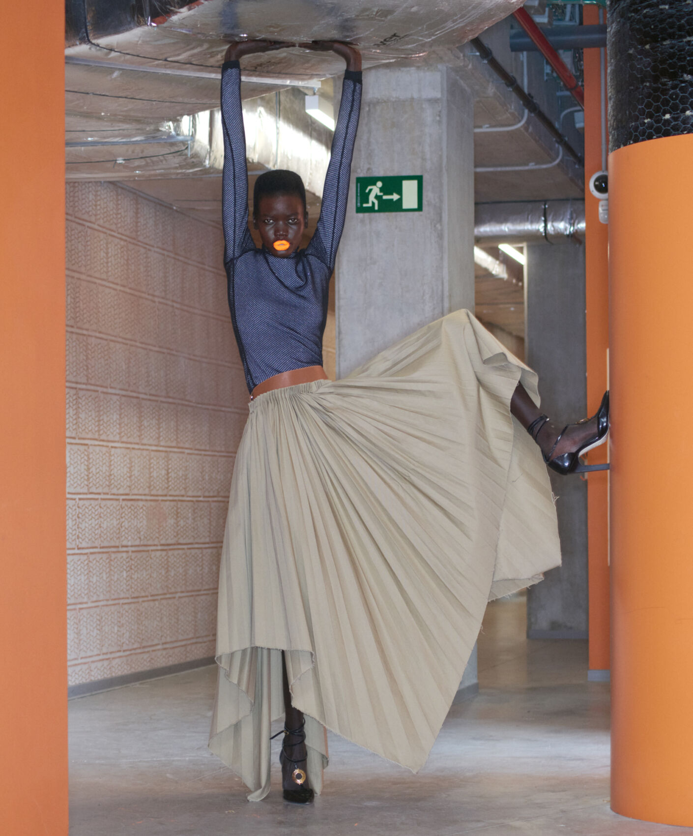 A person hangs from a ceiling structure in a modern industrial setting. They wear a long, flowing, pleated beige skirt and a fitted dark top. Their striking presence is accentuated by bright orange accessories and open-toed high-heeled shoes. The backdrop features concrete walls, orange pillars, and exposed pipes, adding to the edgy, avant-garde vibe.