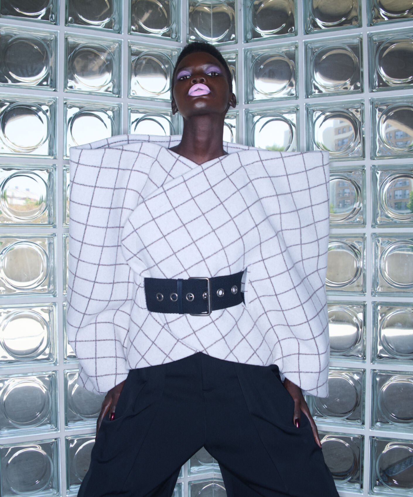 A confident individual poses against a backdrop of textured glass blocks. They wear an oversized, structured top with a black grid pattern and a wide black belt, paired with dark trousers. The makeup is bold, featuring pink lips and purple eyeshadow. The setting is modern and minimalist, emphasizing the avant-garde fashion and strong visual contrast.