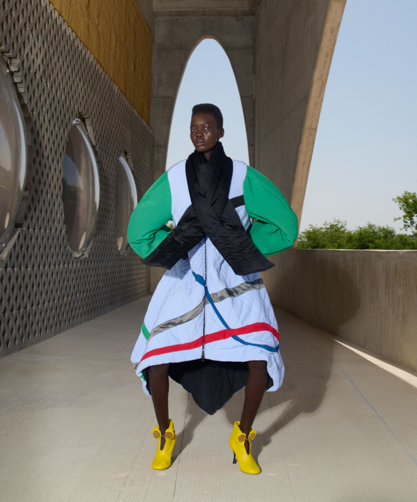 A person stands confidently in a futuristic architectural setting. They wear a colorful, avant-garde outfit featuring bold greens, blacks, blues, and reds, complemented by bright yellow shoes. The structure around them includes geometric patterns and circular windows, with a concrete arch and outdoor elements visible in the background. The scene blends fashion with modern architectural design.