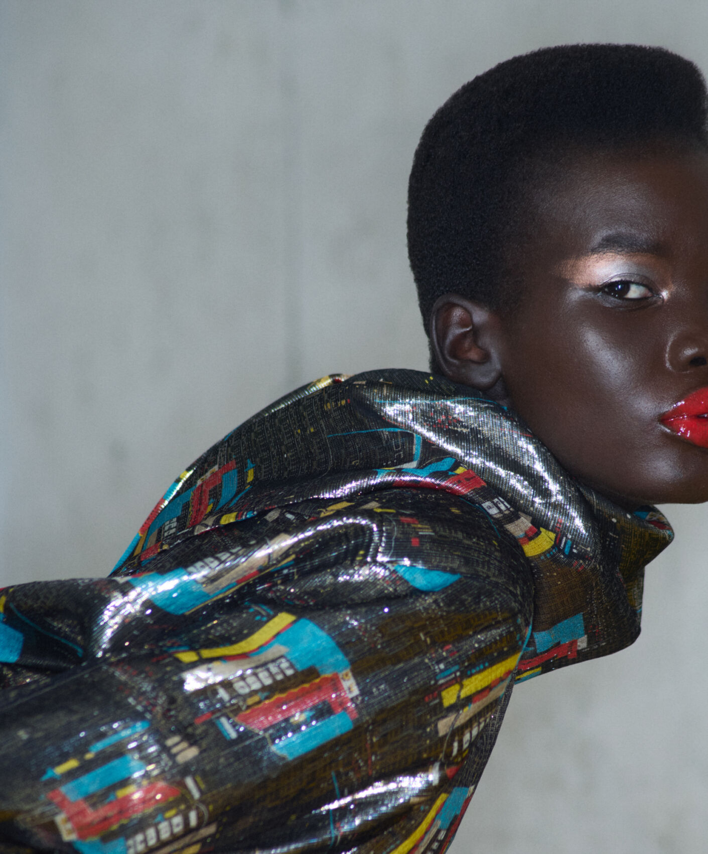 A person with a stylish, close-cropped hairstyle is seen with dramatic makeup, featuring bold red lips and shimmering eyeshadow. The person wears a shiny, textured garment exhibiting vibrant geometric patterns with hues of blue, red, yellow, and black. The overall aesthetic is contemporary and striking, emphasizing a blend of fashion-forward elements and artistic expression against a neutral background.