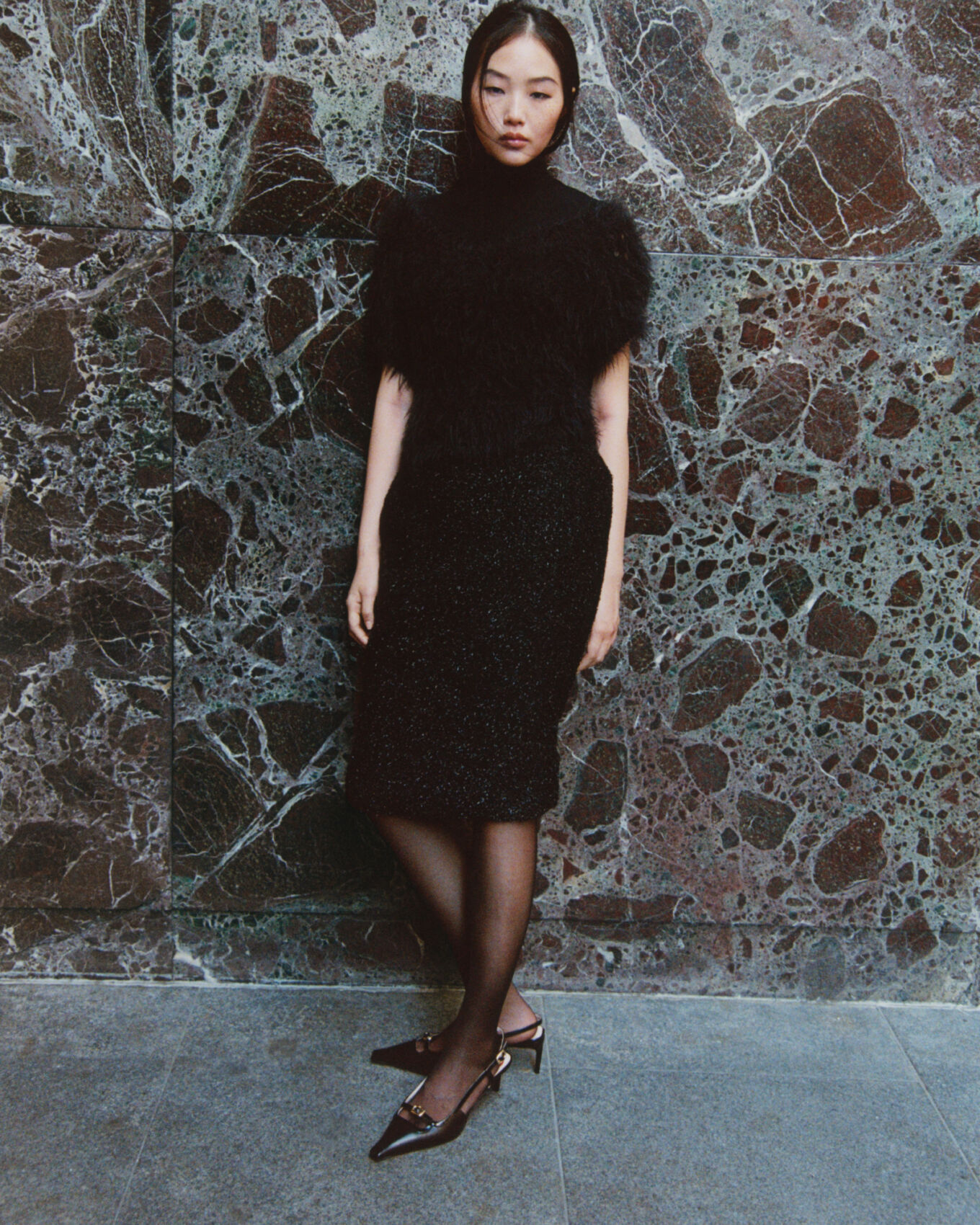 A woman stands against a dark, textured marble wall. She wears a high-neck, short-sleeve black top and a matching knee-length skirt. Her outfit features different textures, with a feather-like appearance on the top. She also sports sheer black stockings and pointed heels with metallic details. Her expression is serene, and her hair is straight and sleek.