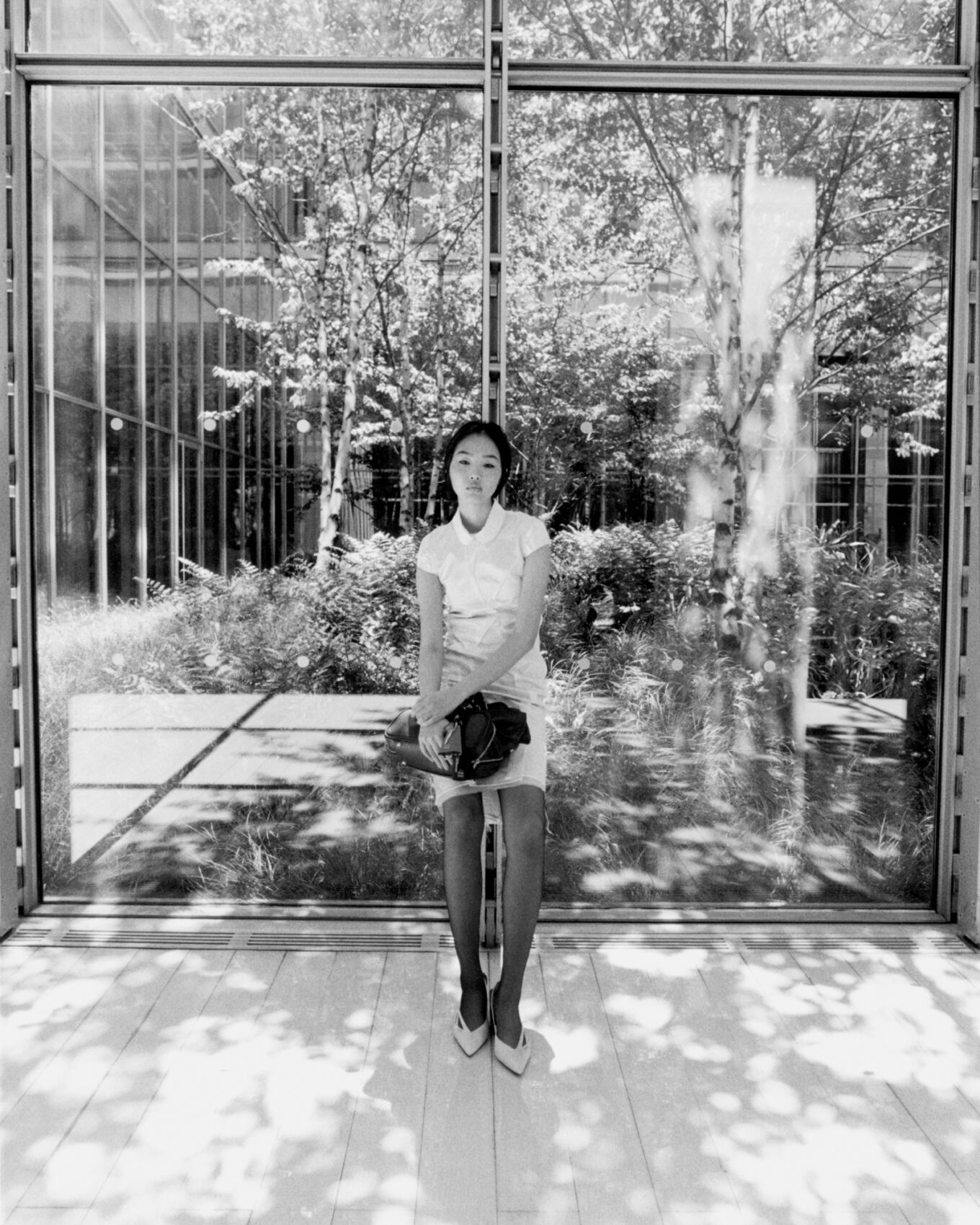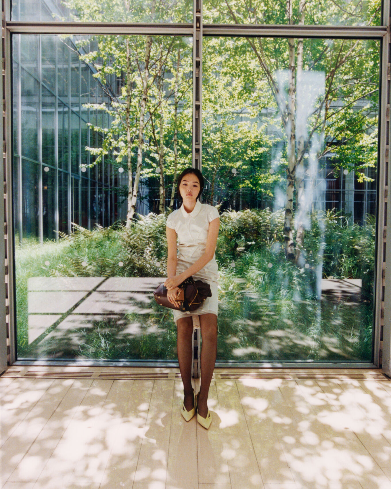 A woman in a white dress sits on a wooden floor, holding a brown bag. She is positioned in front of large glass panels that reveal a lush, sunlit garden with trees and greenery. Soft natural light filters through, casting shadows on the floor. The setting is peaceful and blends the interior with the natural exterior.