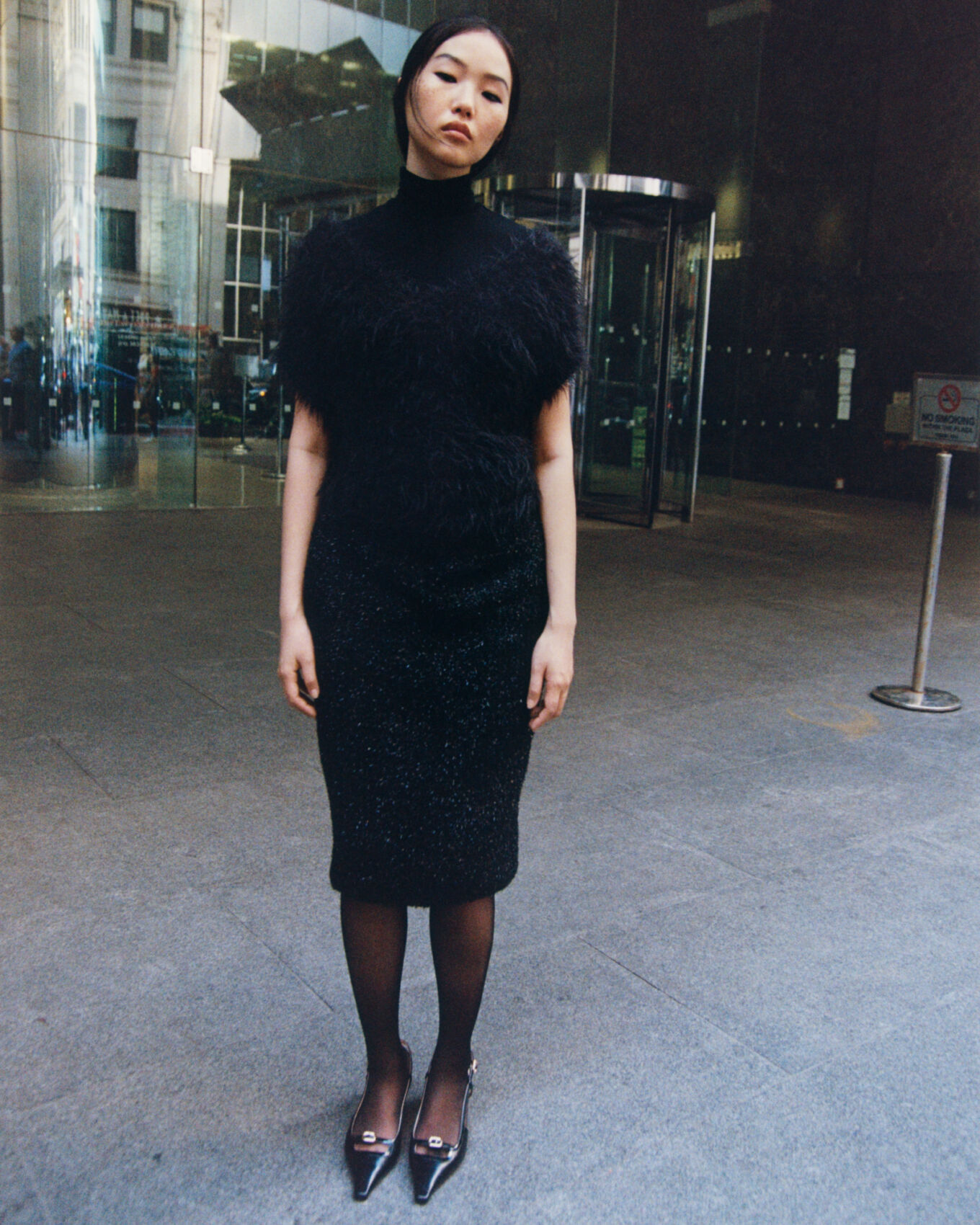 A person stands on a city sidewalk in front of a modern glass building. They're wearing a black outfit consisting of a textured top and knee-length skirt, paired with sheer stockings and shiny pointed shoes. The urban backdrop features reflections and a revolving door, contrasting with their composed and serene expression.