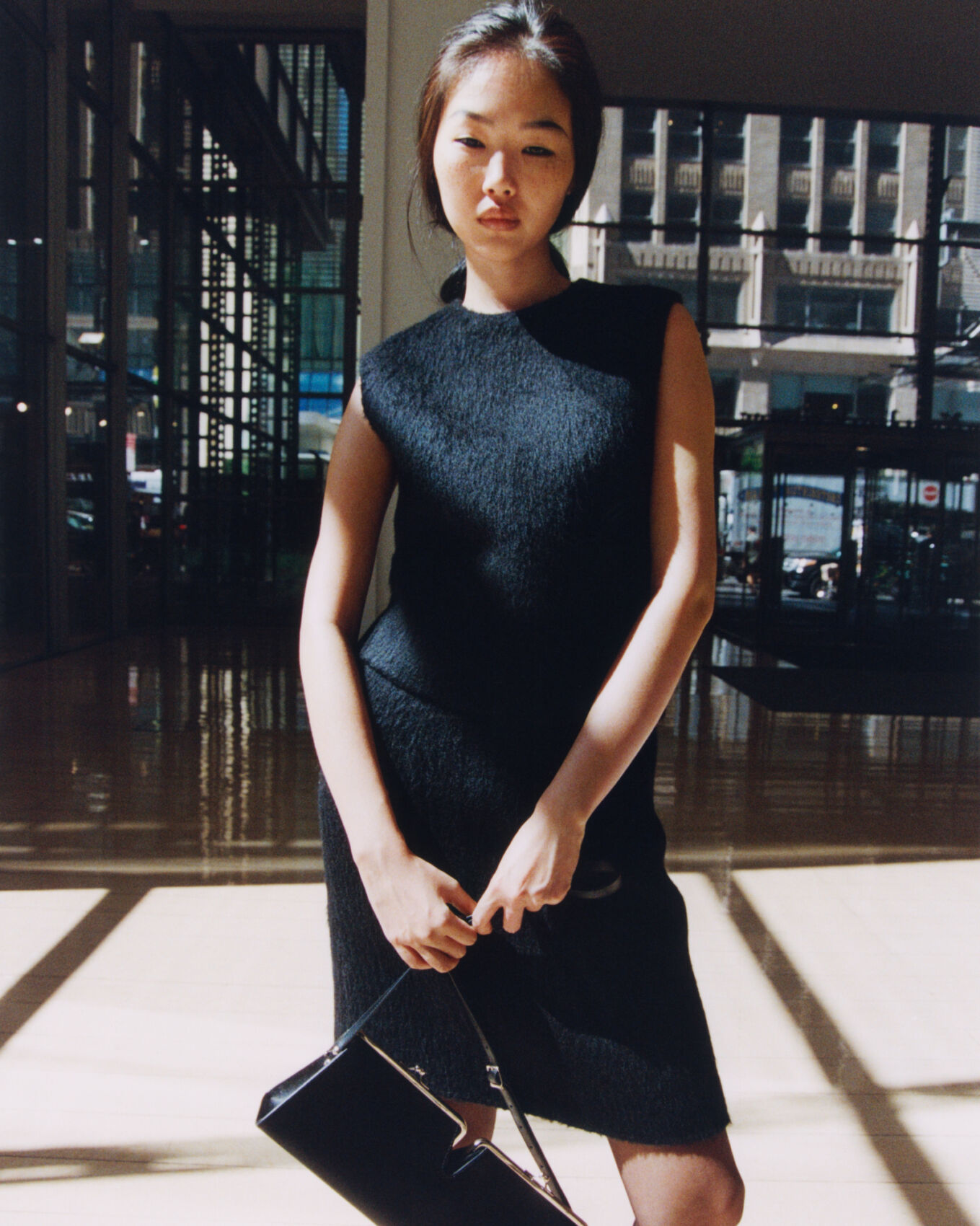A person stands in a sunlit indoor setting, casting shadows on a polished floor. They wear a sleeveless black dress and hold a black handbag. Large windows in the background reveal an urban exterior with tall buildings. The lighting creates a contrast between the bright sunshine and shaded areas, enhancing the scene’s modern and sophisticated atmosphere.