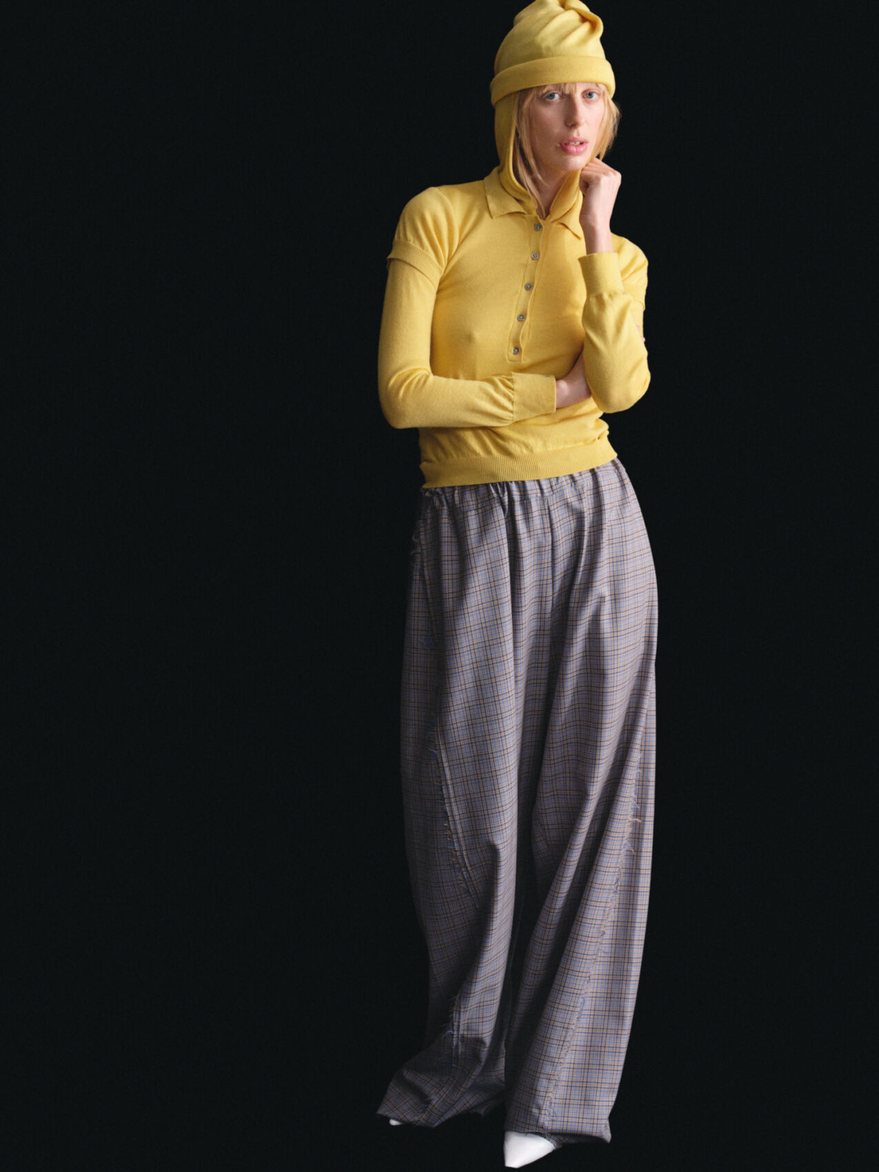 A person stands poised, wearing a bright yellow long-sleeve top and matching hat. Their ensemble is completed with loose-fitting plaid trousers in muted tones. The backdrop is solid black, drawing focus to their contemplative expression and relaxed pose. The contrast of vivid yellow against the dark background creates a striking visual effect.