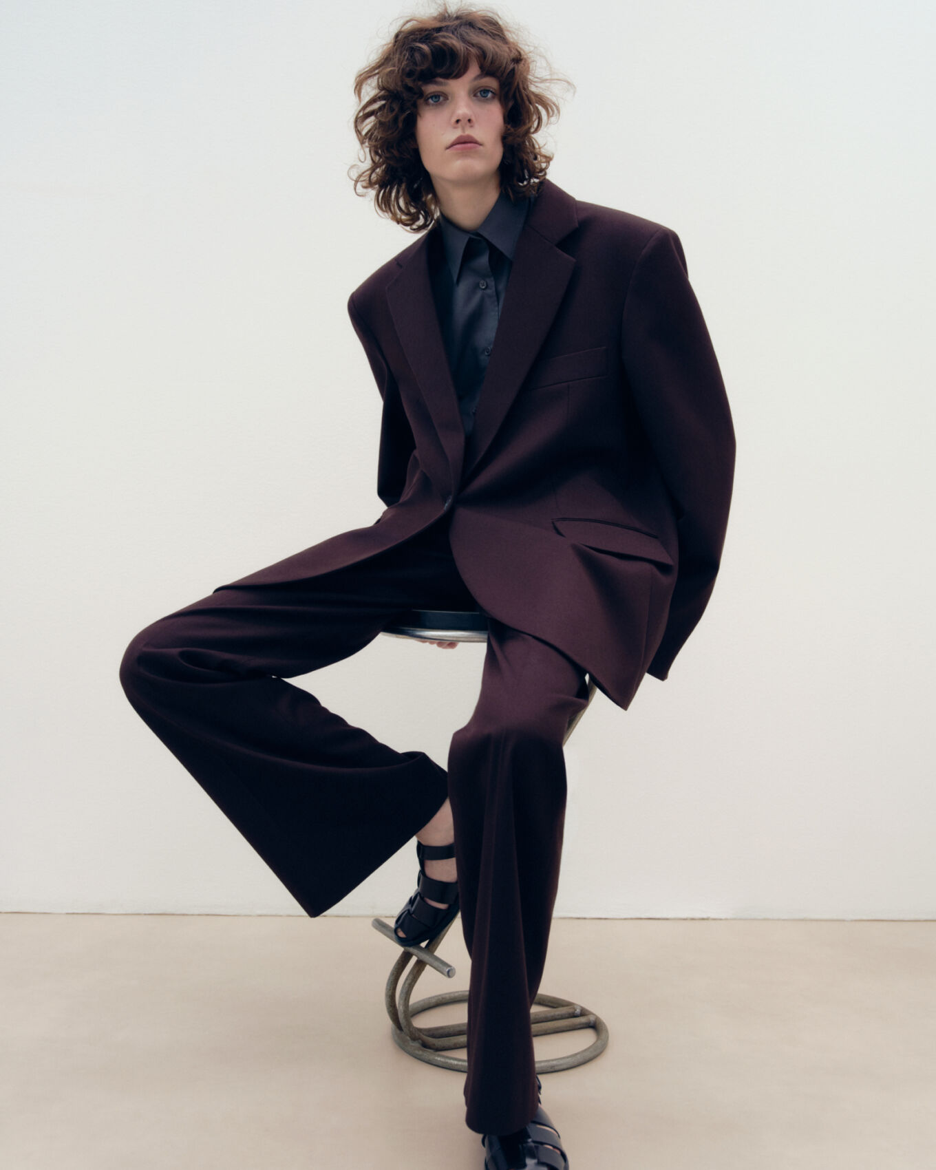 A person with curly hair sits on a modern chair against a plain background. Dressed in an oversized dark suit with a matching shirt, the individual exudes a confident, relaxed pose. The chair features a unique swirling design, complementing the minimalist setting. The person's expression is thoughtful, adding a contemplative mood to the scene.