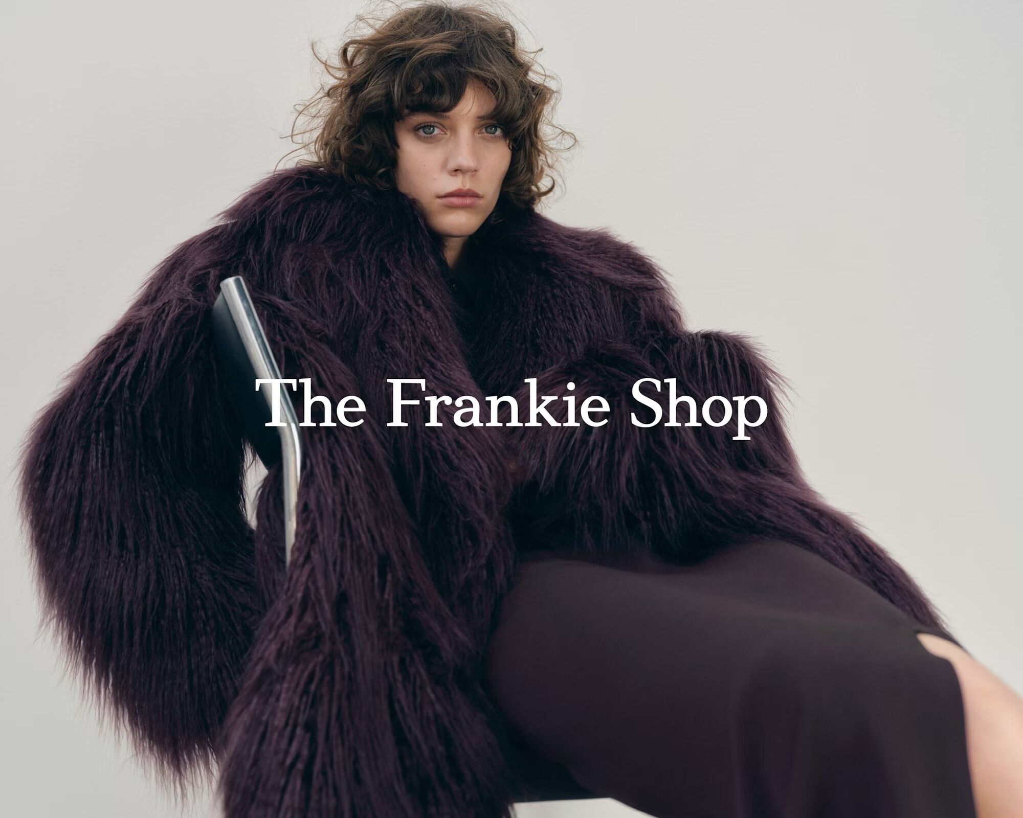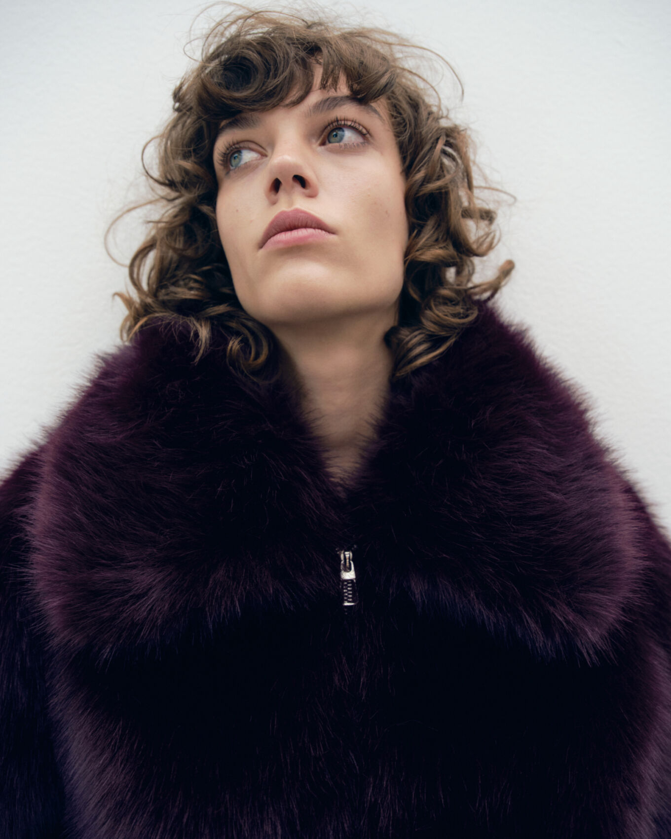 A person with tousled, curly hair gazes intently, clad in a plush, oversized deep plum fur coat that drapes elegantly. They are seated on a sleek, minimalist chair, exuding a blend of sophistication and nonchalance. The background is a soft, muted gray, enhancing the focus on the luxurious texture and rich hue of the attire.