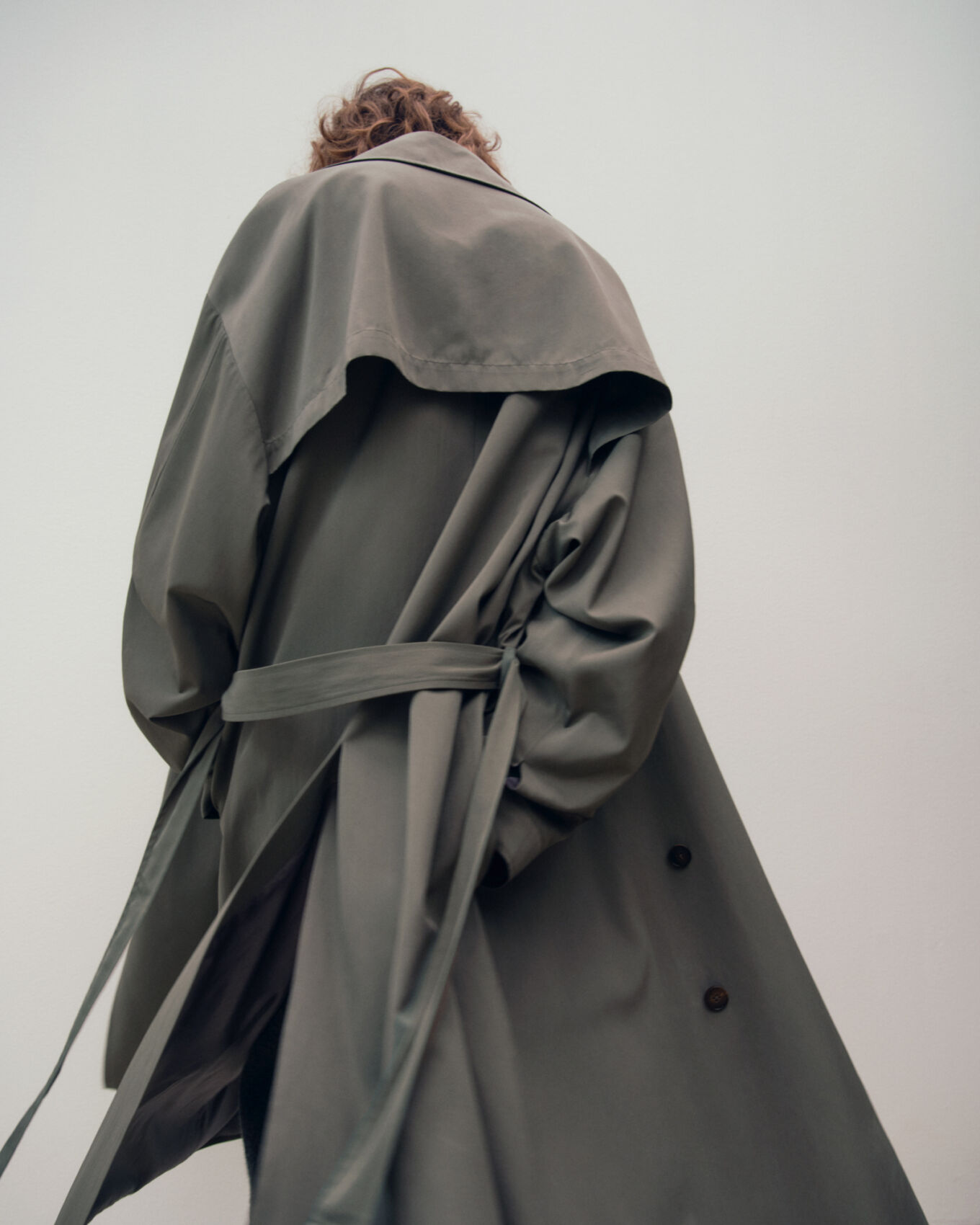 A person with curly hair is seen from the back, wearing an oversized, draped trench coat in an earthy tone. The coat, featuring a belt and double-breasted design, billows slightly as if caught in movement. The background is a soft, neutral color, lending minimal distraction and emphasizing the garment’s structure and fabric texture. The overall mood is serene and stylish.