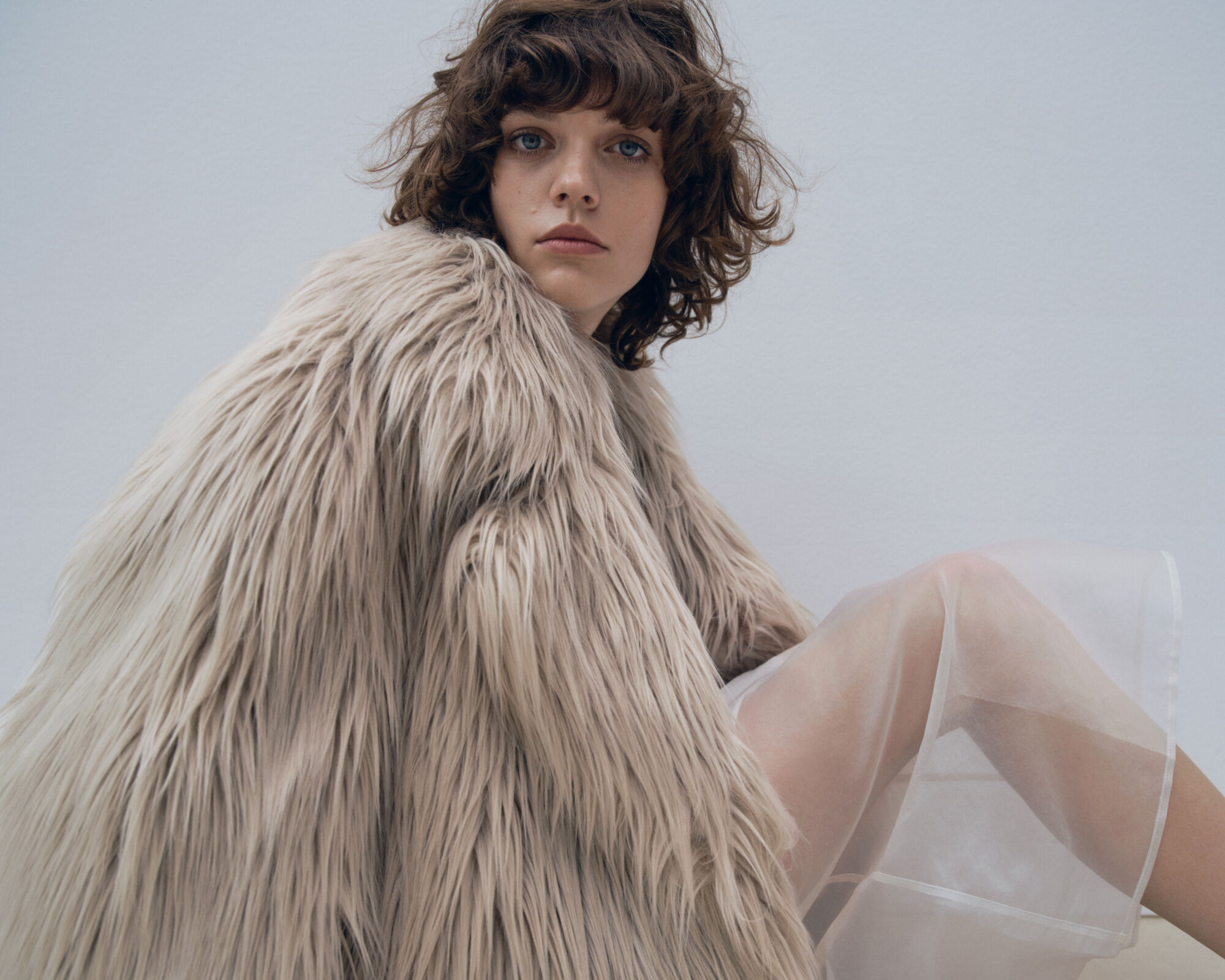 A person with curly hair gazes intently, clad in a voluminous shaggy coat of light beige fur. The texture contrasts with the delicate, transparent fabric draped over one knee, creating a play of materials. The background is softly lit, enhancing the serene yet introspective mood. The scene evokes a sense of chic warmth and understated elegance.