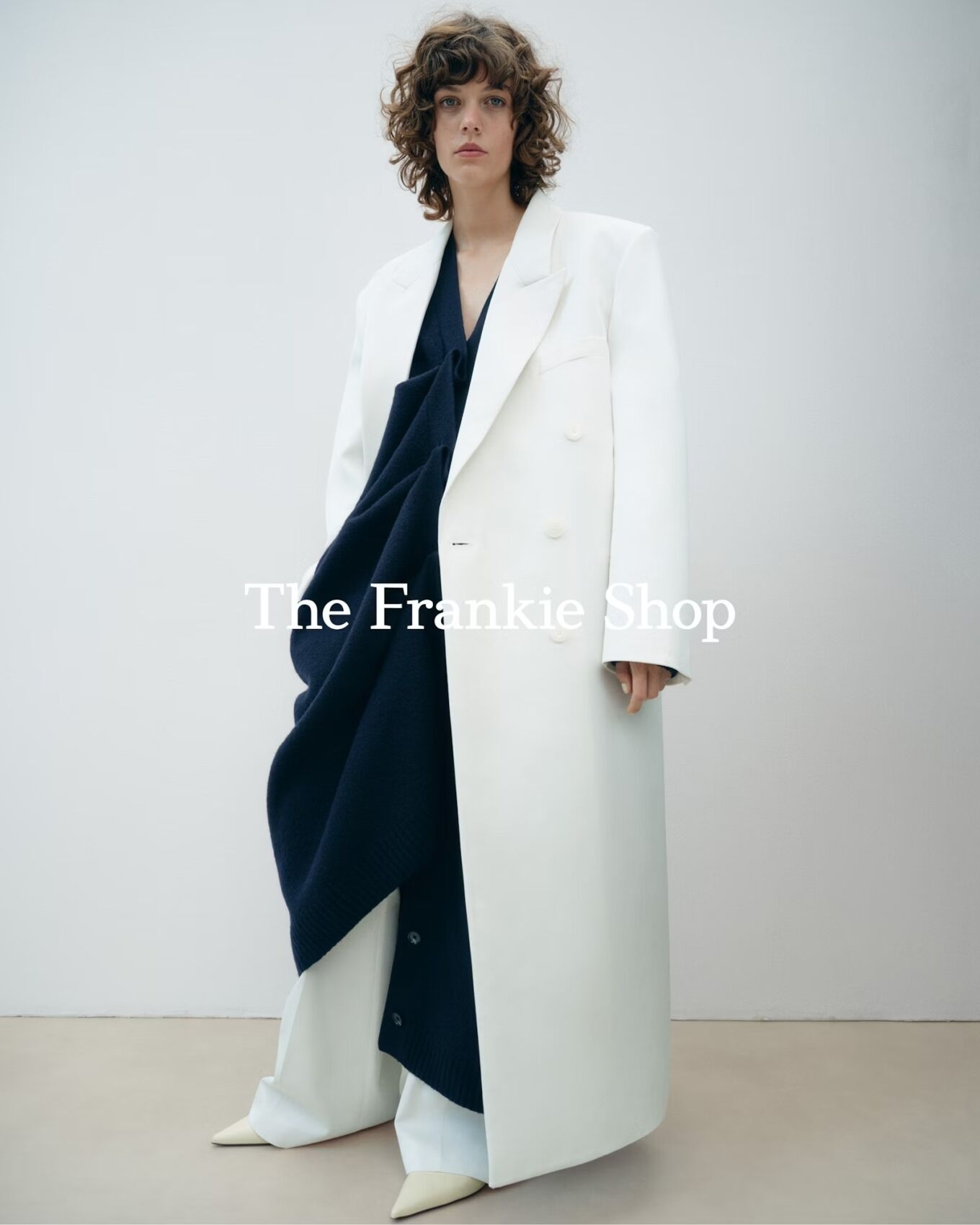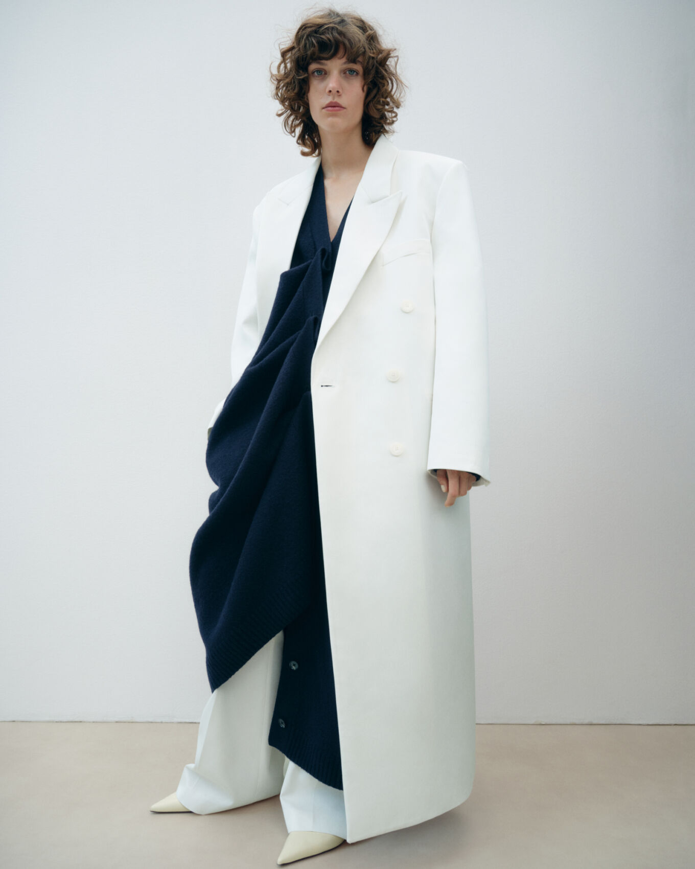 A person stands in an off-white room, wearing an oversized white coat over a draped dark blue garment. Their expression is neutral, and they have curly, shoulder-length hair. The ensemble includes wide-leg white pants and pointed, cream-colored shoes. The overall aesthetic is minimalist and fashion-forward, with a focus on layering and contrast.