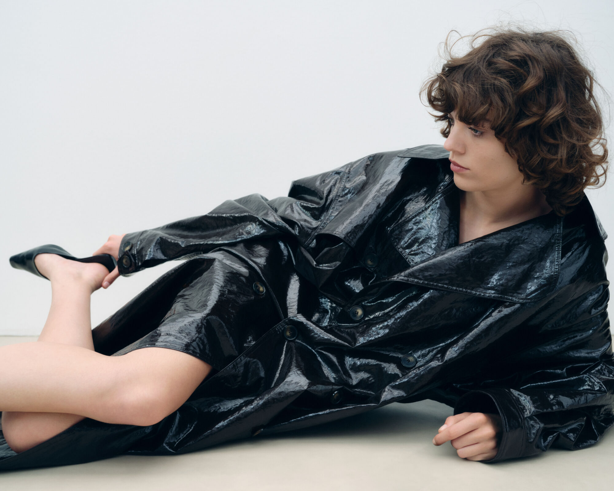 A person with curly hair reclines on the floor, dressed in an oversized, glossy black coat. Their expression is contemplative, and one hand adjusts a black shoe on their foot. The background is minimal, focusing attention on the reflective texture of the coat, creating a modern and stylish ambiance that combines elegance and nonchalance.