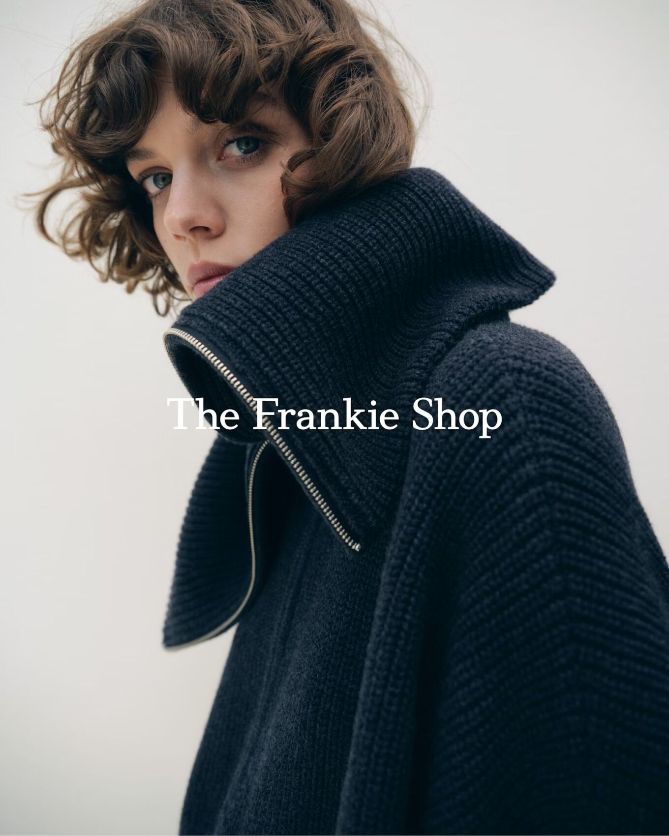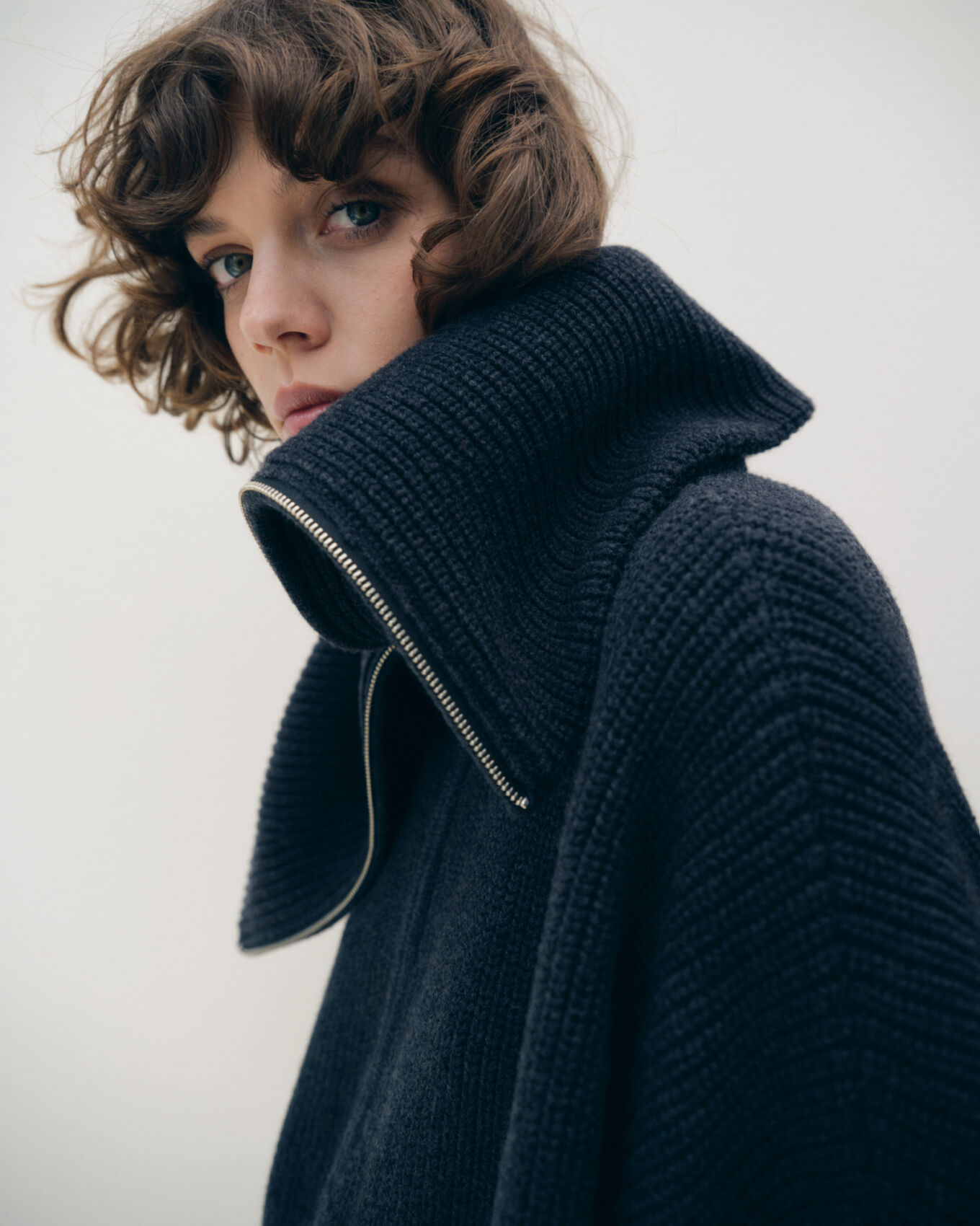 A person with curly brown hair gazes softly, wearing a high-collared, dark knitted garment. The collar is prominently folded, creating a cozy yet stylish look. The background is a muted, light shade, drawing attention to the subject’s thoughtful expression and the texture of the fabric. The overall mood conveys simplicity and elegance with a touch of modern fashion.