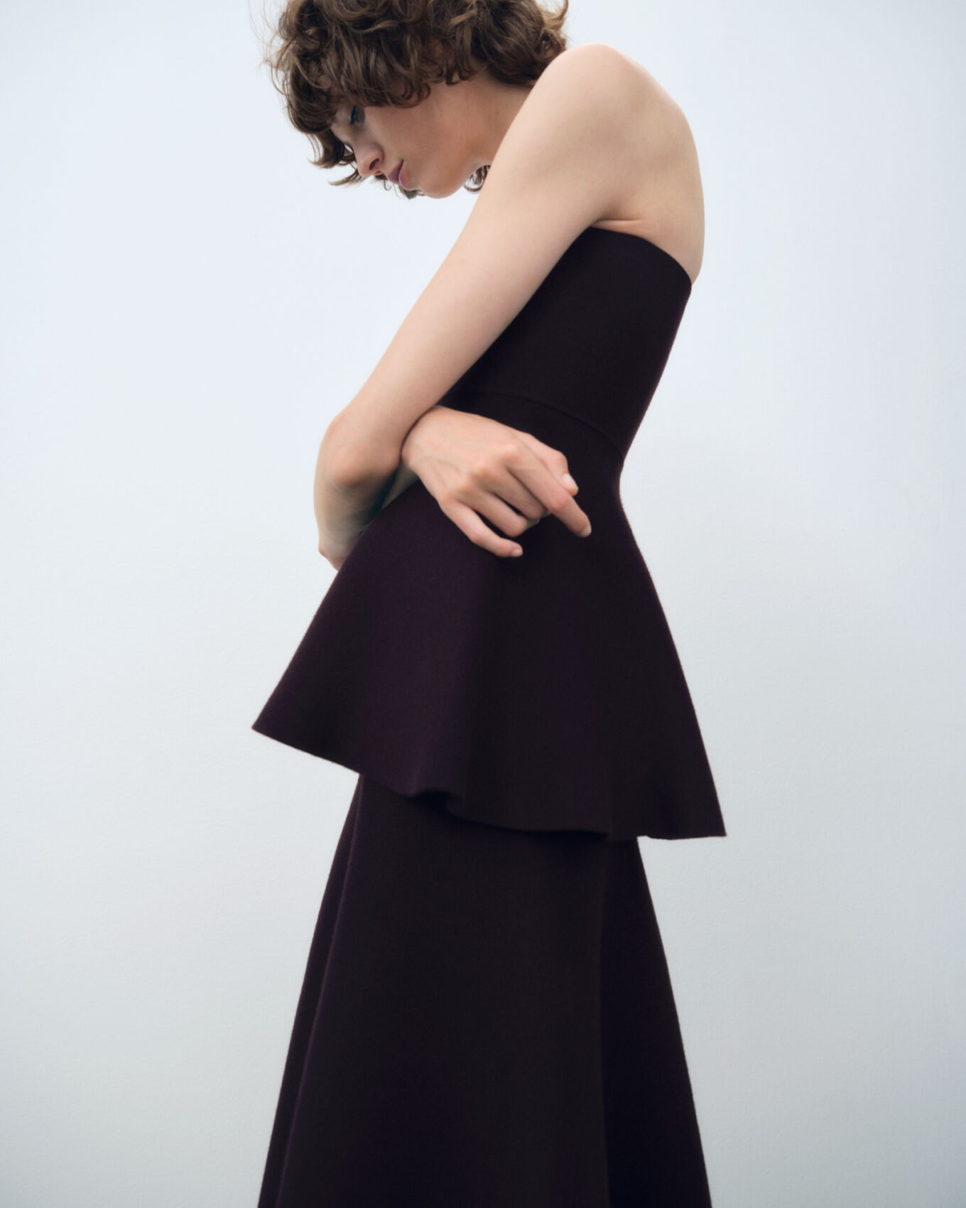 A person with curly hair is shown wearing an elegant, dark, strapless dress with a flared peplum design. The graceful pose involves crossing the arms in a subtle manner. The clean, minimalist background emphasizes the outfit’s sophistication, highlighting the chic and modern style. The composition captures a blend of fashion-forward flair and understated elegance.