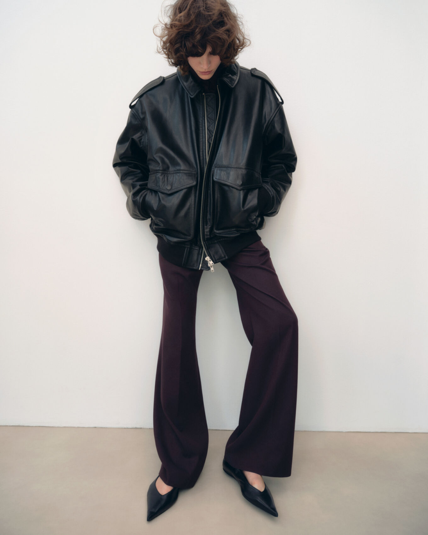 A person stands against a plain background, wearing a large black leather jacket with a high collar and oversized shoulders. Their hands are tucked into the pockets of widely flared, dark trousers. Black pointed shoes complete the ensemble. Their curly hair falls freely over their forehead, creating a relaxed, stylish look with a modern, minimalist aesthetic.