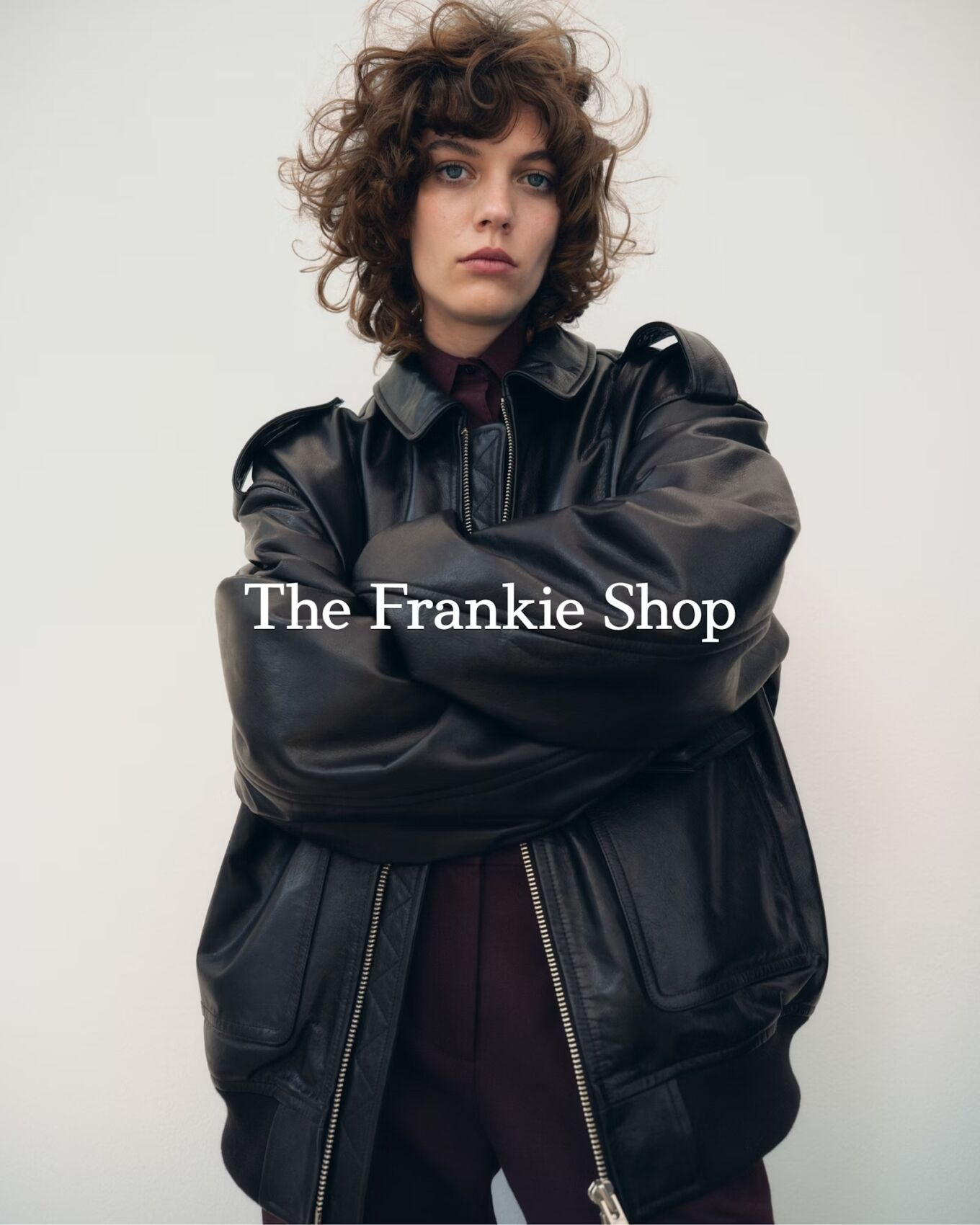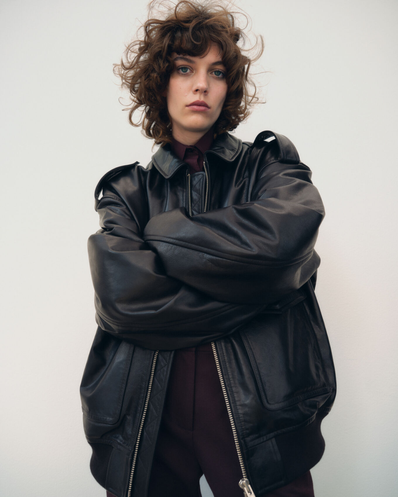 A person stands confidently with arms crossed, displaying a relaxed yet assertive stance. They wear a dark, oversized leather jacket with large pockets and a partially visible zipper. The individual has curly hair and a serious expression. The background is plain and neutral, highlighting the clothing and the person's poised demeanor.