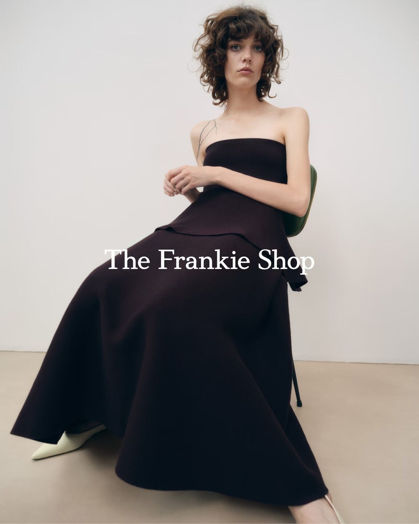 A woman with short, curly hair sits on a green chair against a minimalistic backdrop. She wears a strapless, dark-colored dress with a flowing, structured silhouette. Her expression is serene, and subtle makeup enhances her features. Her pose, with folded arms, exudes elegance and confidence. The setting is simple, highlighting the outfit's sophisticated design.