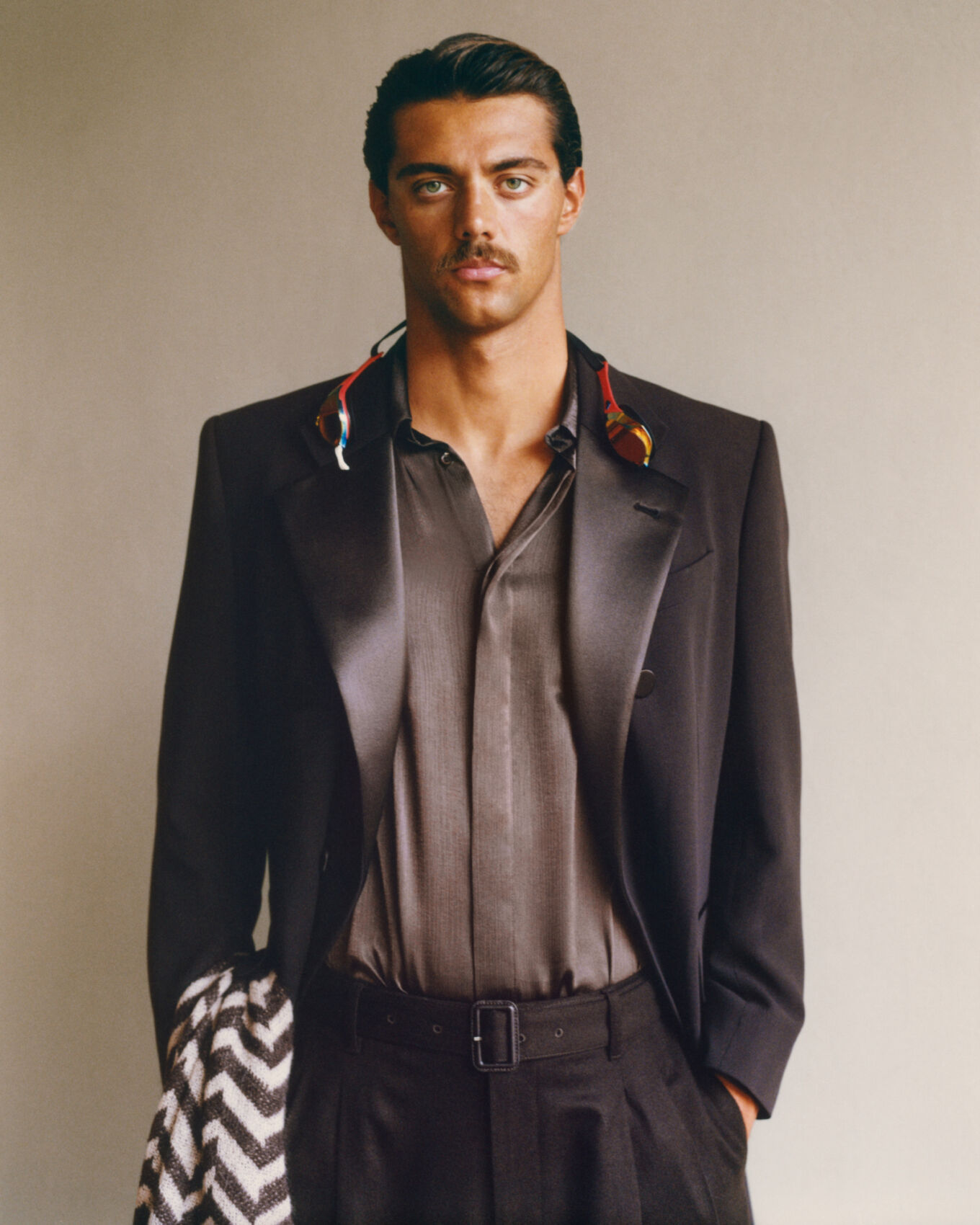 A man with a serious expression stands against a neutral background. He wears a dark blazer over a silky shirt, and a patterned scarf is draped across one shoulder. Swim goggles hang around his neck, adding a touch of color. His hair is slicked back, and he sports a neat moustache, exuding a confident and stylish aura.