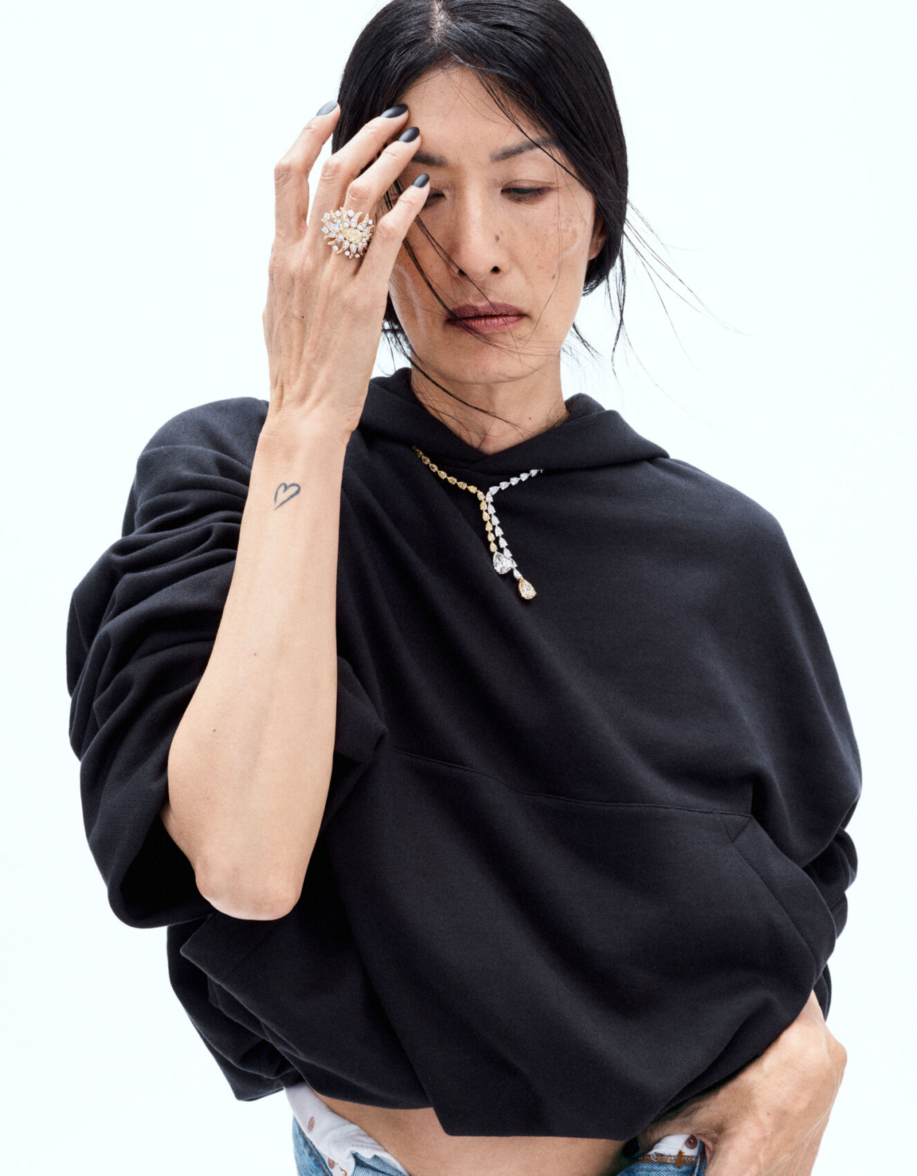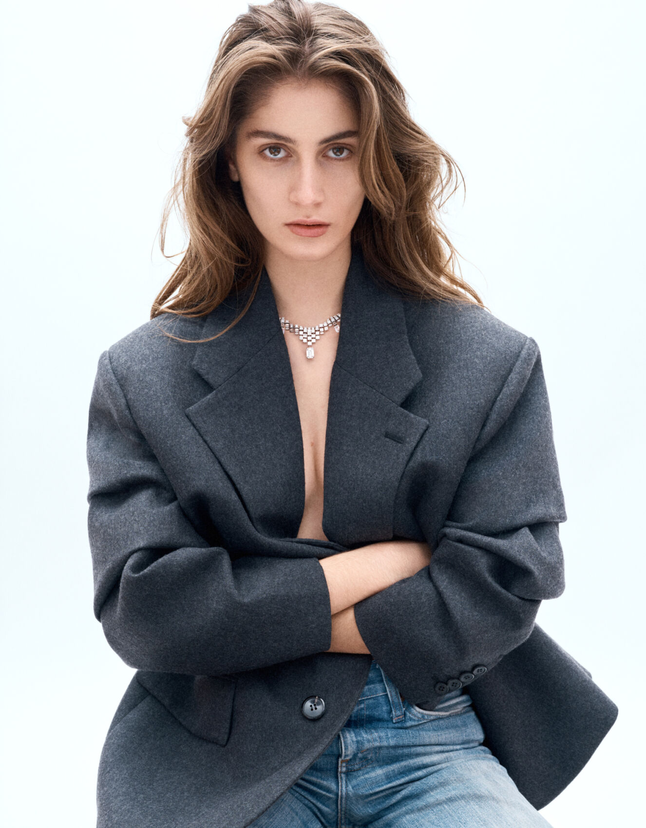 A woman with long, wavy brown hair gazes directly, her expression calm and serious. She wears a dark oversized blazer with no shirt beneath, revealing a striking diamond necklace. Her arms are crossed over her torso, and she pairs the blazer with casual blue jeans. The background is a soft, light color, providing a minimalist setting.