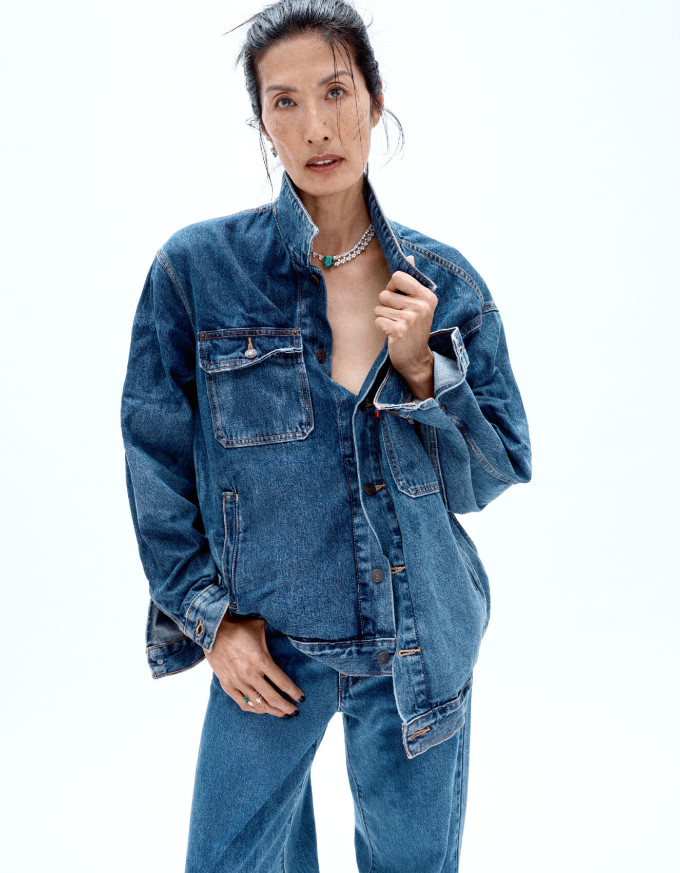 A person stands confidently, wearing a denim jacket and matching jeans. The jacket is partially unbuttoned, revealing a layered necklace around the neck. The individual has an expression of calm determination, with hair styled up. Hands are posed naturally, with rings visible on fingers. The denim ensemble is characterized by its classic blue hue and casual style.